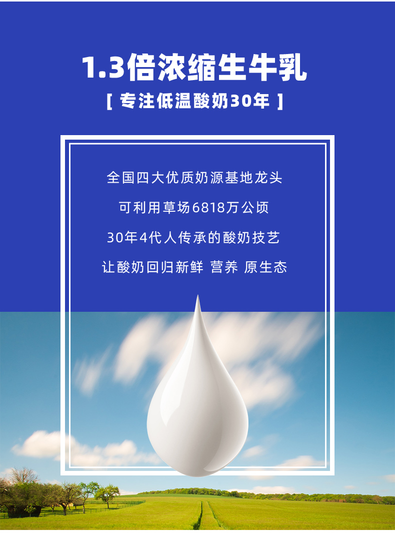 这款酸奶采用草原独特菌种,黄金比例发酵,1.3倍浓缩生牛乳含乳量≥98%,纯粹还原酸奶自然本味,无添加剂,只添加少量糖调味,口感酸甜滑润,营养丰富,老少皆宜。可直接吃,也可制作冰激淋,水果布丁等,吃法百搭。