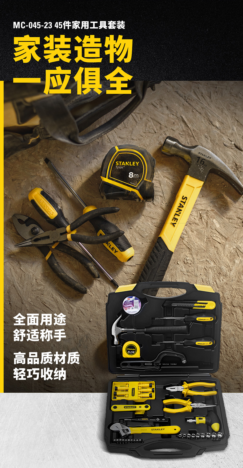 这款45件套件包含一字头十字头螺丝刀、7件折叠内六角扳手、羊角锤、钢锯、卷尺、测电笔、螺丝批套件等。可以满足了一般家用所有的需求。本身带收纳箱,平时收纳也较方便。