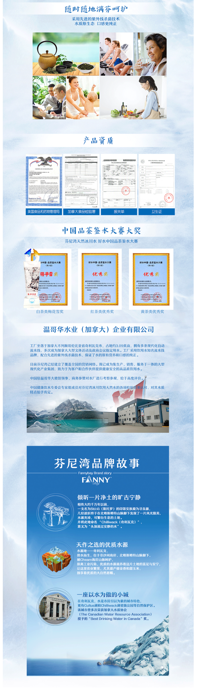 芬尼湾天然冰川水取自加拿大落基山脉,北纬36°-46°,被誉为“黄金水源带”,有水届奥斯卡之称的伯克利斯普林斯国际品水大赛的会议主席、全球顶级品水大师亚瑟表示,产自“黄金水源带”的水可能还占不到这1%饮用水中的千分之一甚至万分之一,因此产自这里的冰川水可谓水中万分之一的甄选。