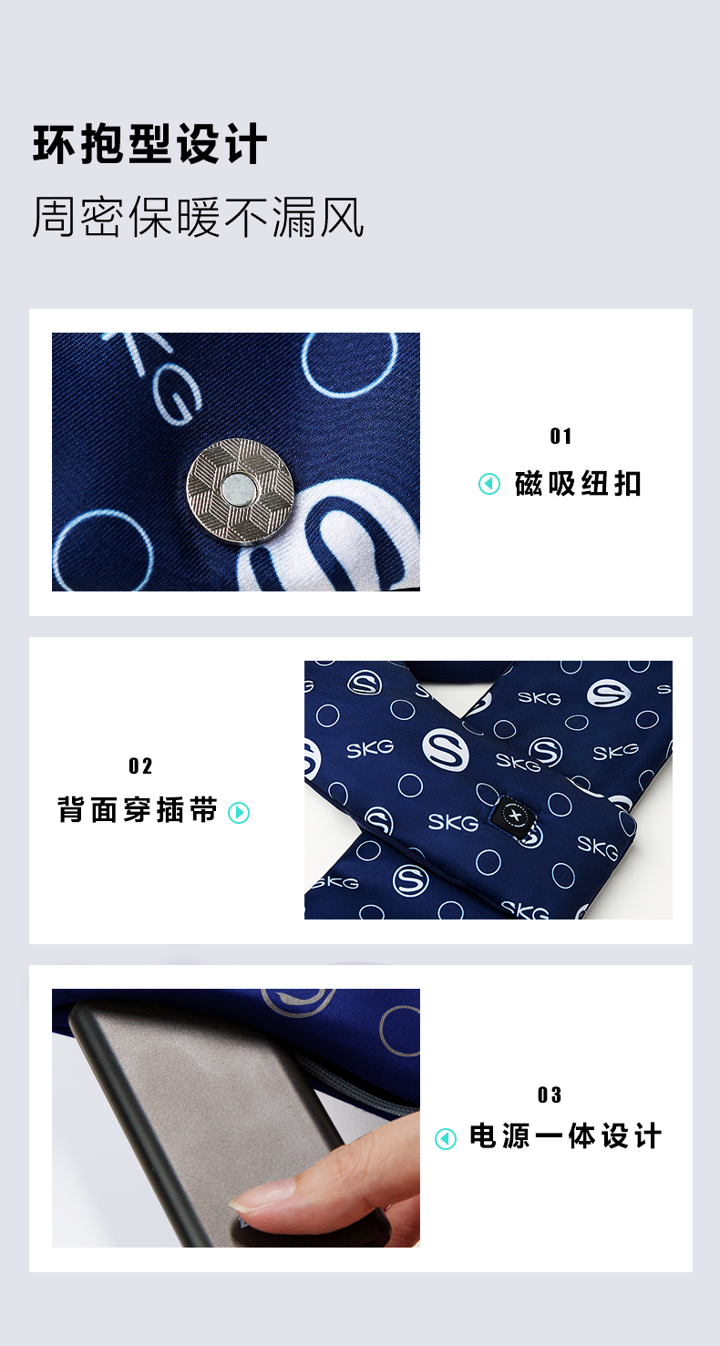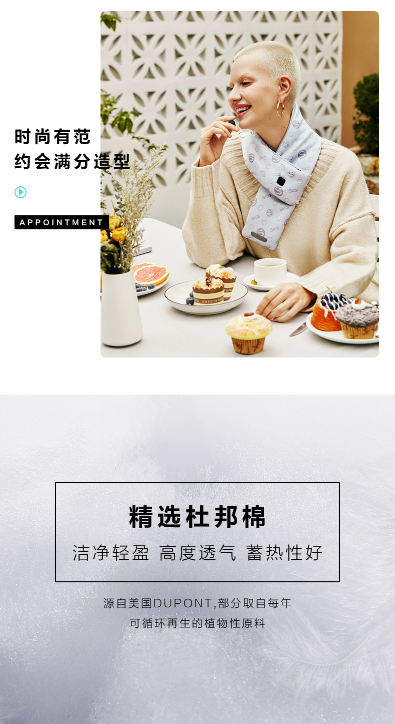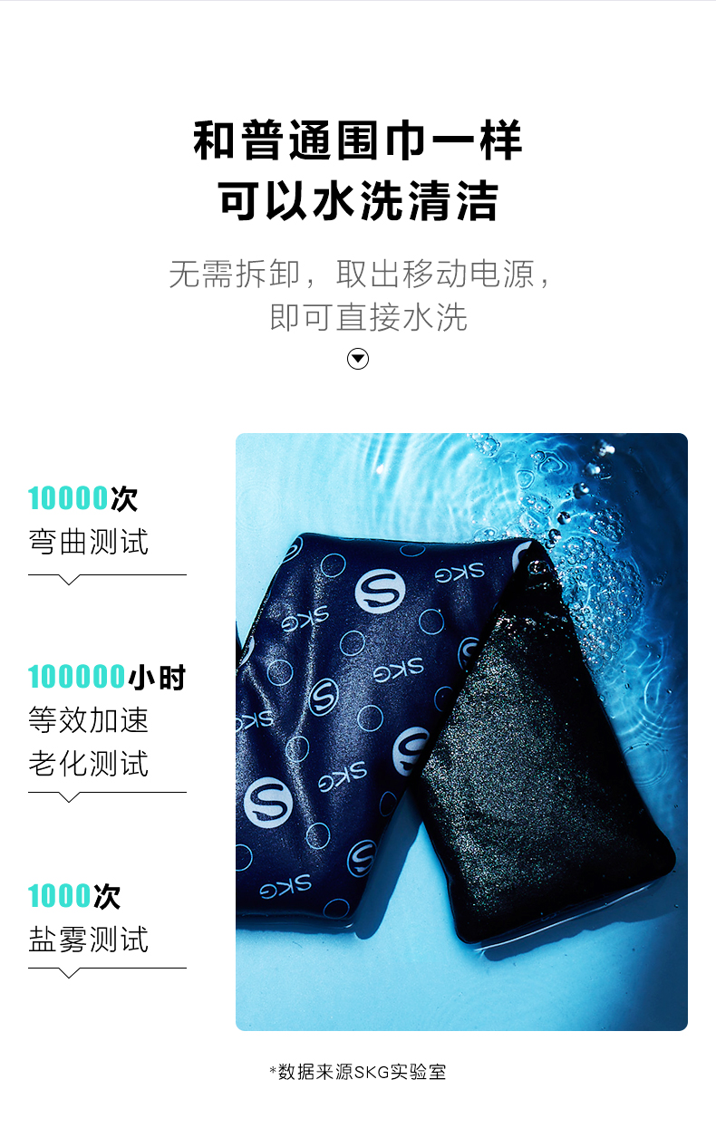 可以和普通围巾一样直接水洗清洁,而且无需拆卸去除移动电源,非常便于后期的维护。磁吸纽扣,背面穿插带,恰到好处的环抱式设计,保暖周密。