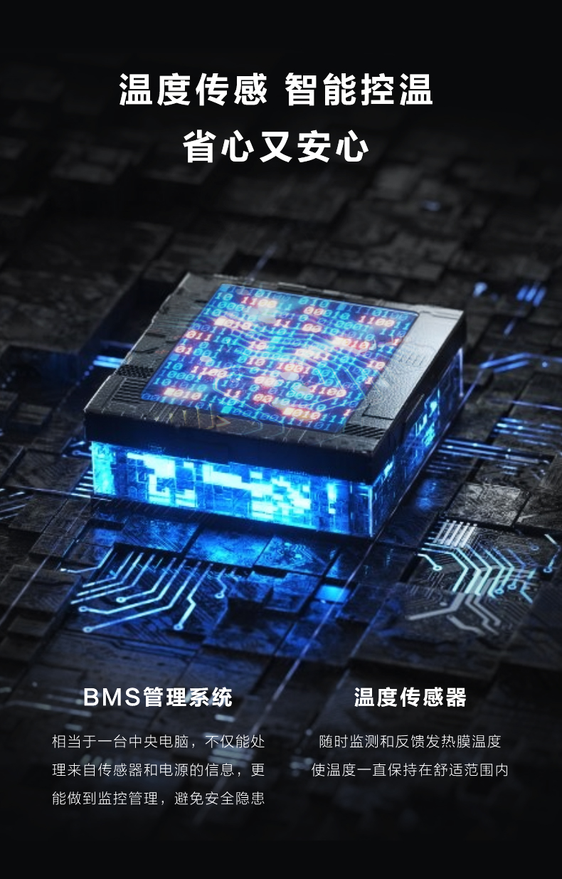 使用BMS管理系统,相当于一台中央电脑,不仅能处理来自传感器和电源的信息,更能做到监控管理,搭配温度传感器,随时监测和反馈发热膜温度,使温度一直保持在舒适范围内,避免安全隐患。