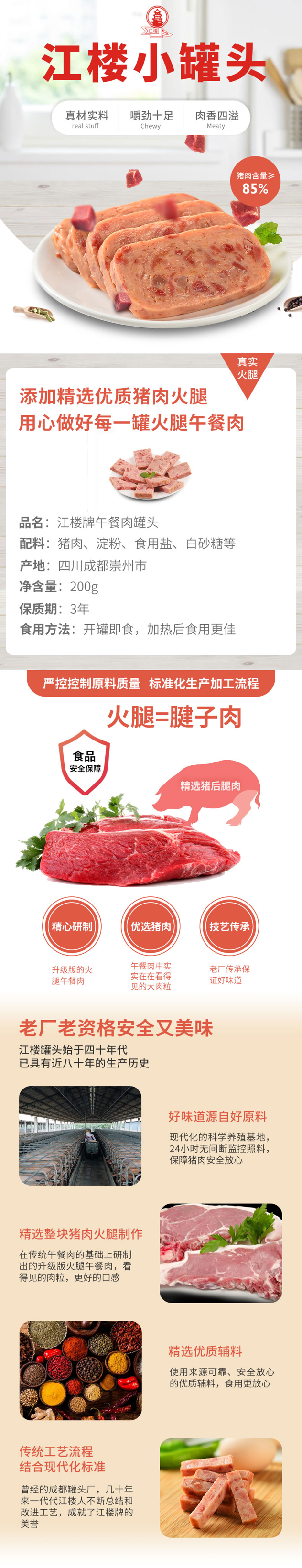 江楼隶属于成都江楼食品有限公司,成立于1942年,曾经是国营成都罐头食品厂,为成都军区制作军需食品,后因资不抵债经历过多次改制,目前还是成都军区联勤部军需罐头的指定生产厂家之一。领券链接点此