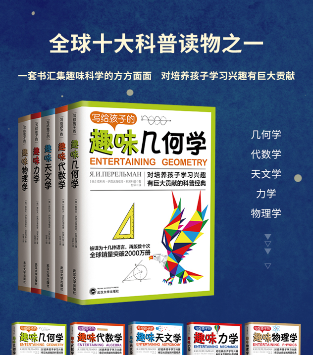 天猫广州青果图书专营店58.8元,可领20元优惠券,实付38.8元到手,包含几何学、代数学、天文学、力学以及物理学,全套5册。著名的全球十大科普书之一,世界科普大师、趣味科学奠基人别莱利曼的代表作品,对全世界青少年科学学习产生深远影响的科普读物。
