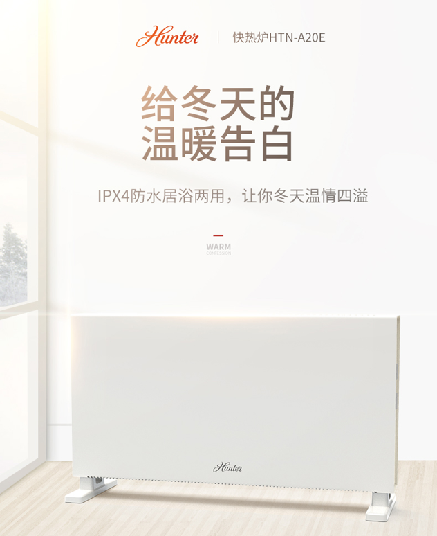亨特(HUNTER)这款型号为HTN-B20E的电暖气,属于对流式电暖器,冷气通过下方进气口进入,被加热上升后从上方出来,通过反复循环让室温提升。热循环的好处在于,不易蒸发空气中的水分子,吹多久都不干燥,而且静音无声。