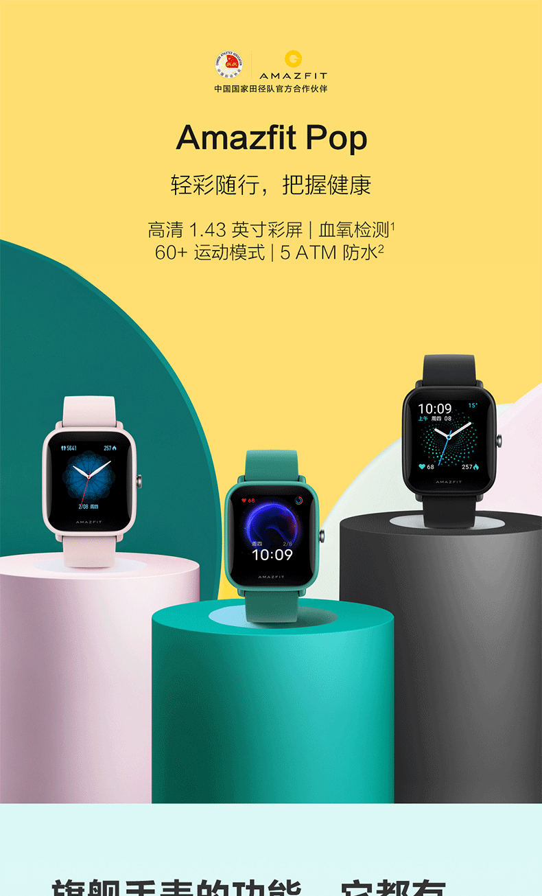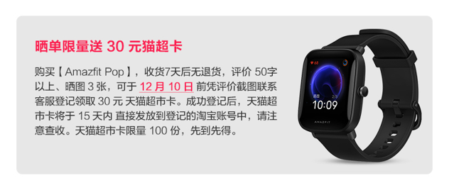 天猫amazfit旗舰店349元,下单立减20元,显示晒图再返现30元猫超卡,实付299元到手,这款Pop是华米今年11月份的新款,价格虽然便宜,但包含24小时心率监测、房颤甄别、实时血氧监测等实用健康功能,还有NFC、运动模式切换等基础功能,旗舰智能手表的功能一个也没少。