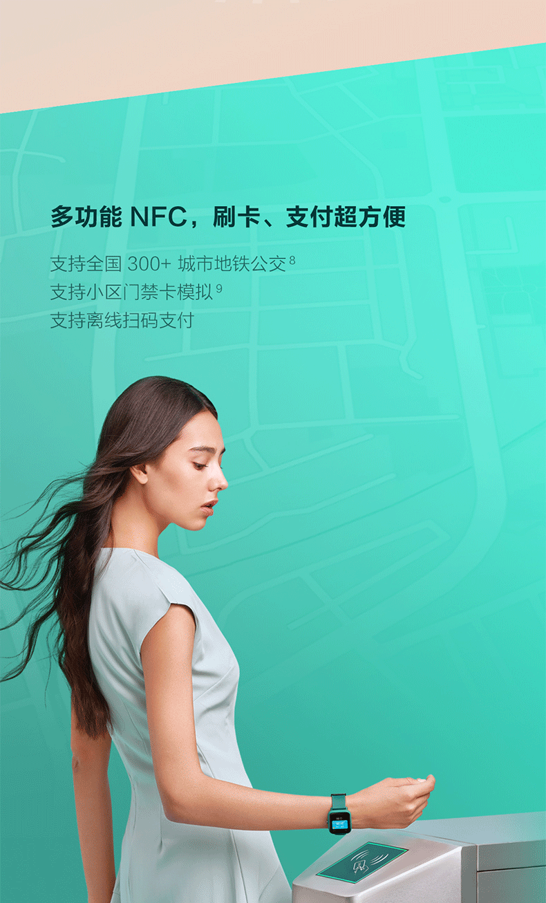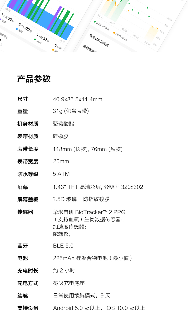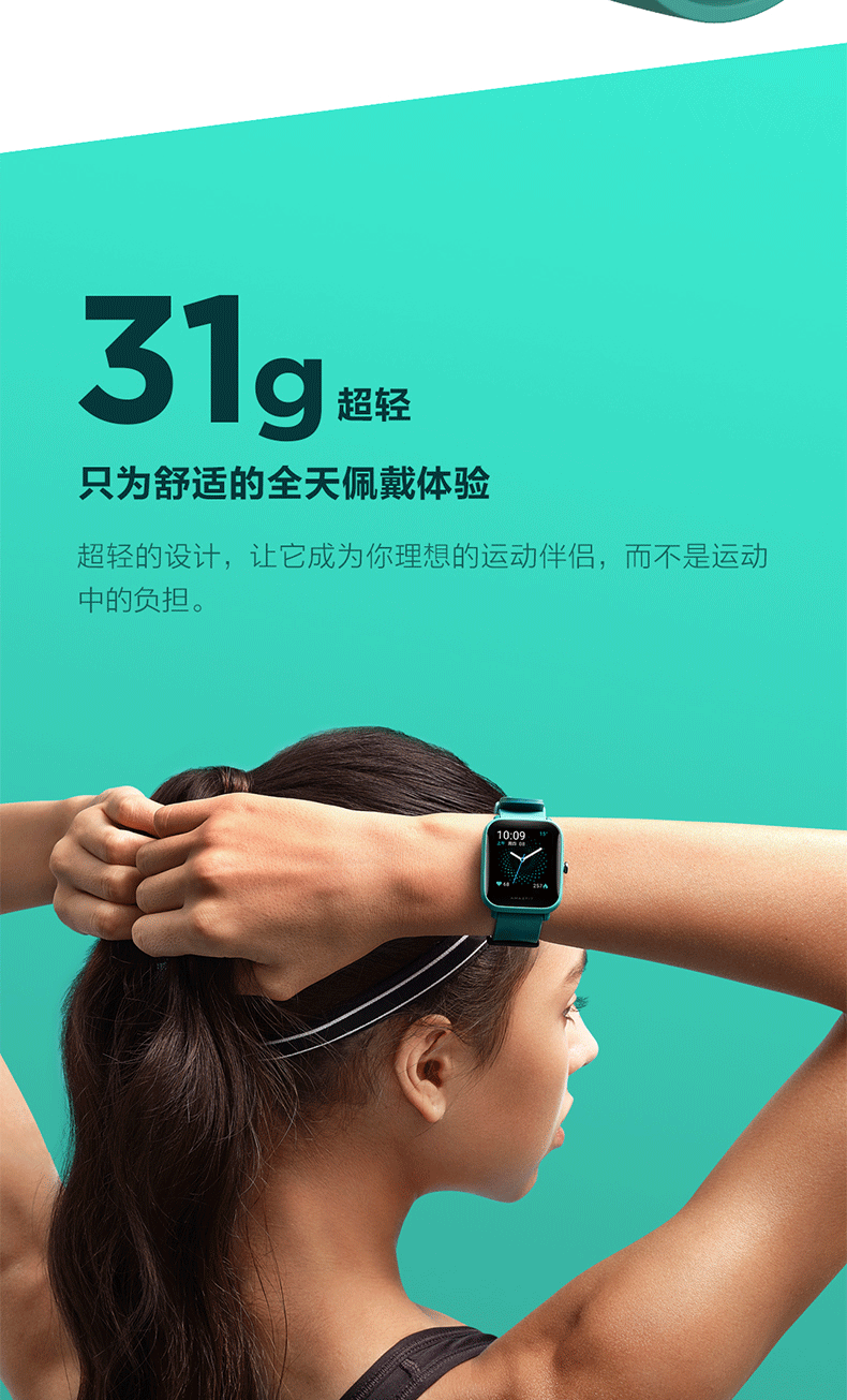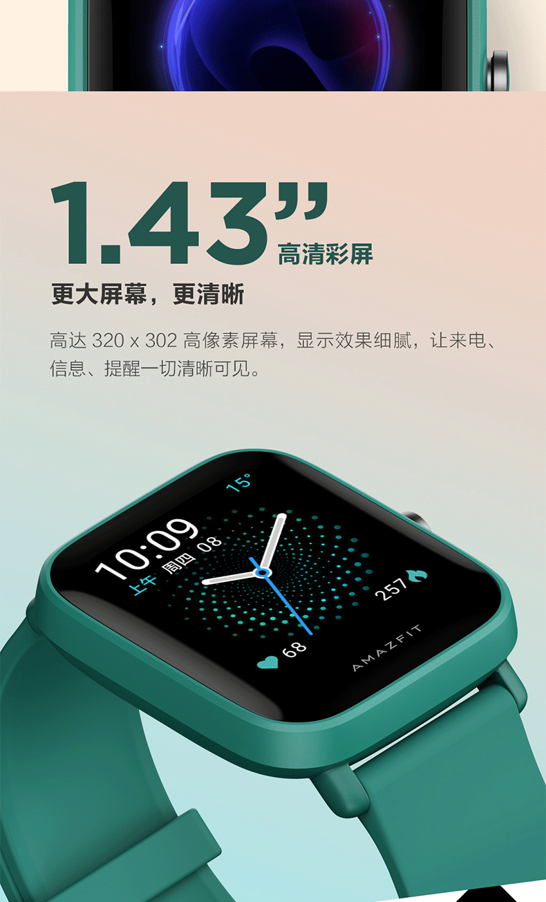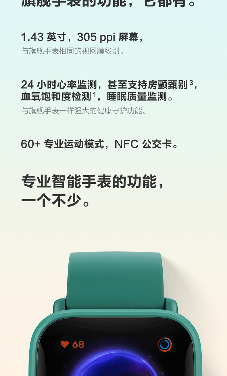 外观设计方面,屏幕为1.43英寸,达到了305ppi的视网膜级别,显示效果细腻,外壳为轻巧橡塑材质,硅胶手表链设计,仅重31g,超轻无负担,全天舒适佩戴体验。