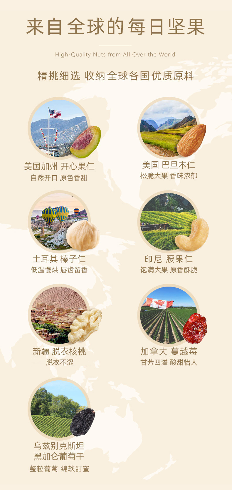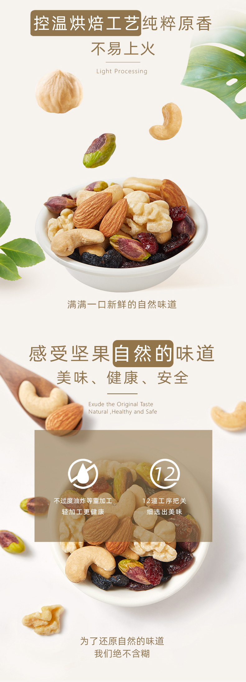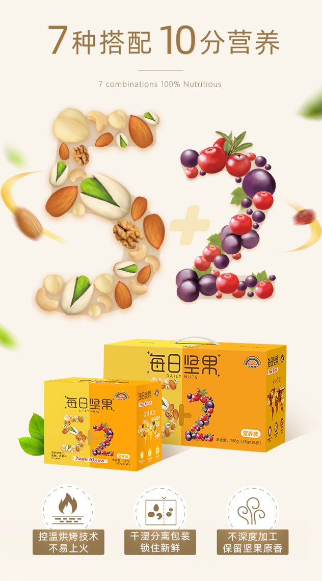 这款天虹牌 混合坚果大礼包。7种坚果果仁搭配,精选原产地进口,美国开心果仁、美国巴旦木、土耳其榛子、印尼腰果仁、新疆脱衣核桃、加拿大蔓越莓、乌兹别克黑加仑葡萄干,超70%坚果比例、控温烘焙工艺,轻加工,纯粹原香,不易上火,符合出口食品标准。最后采用天虹牌特制食品级铝材袋,三层防护,干湿分离,阻氧量阻水量均超98%,还原坚果原味,天然更健康。
