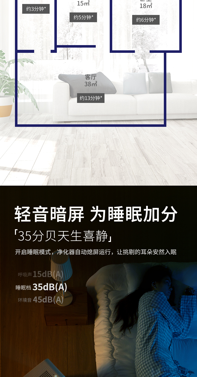 4、有效工作噪音:不能只看噪音,让风扇转的很慢,当然没声音了,所以要看净化器,在有效工作状态的声音大小。