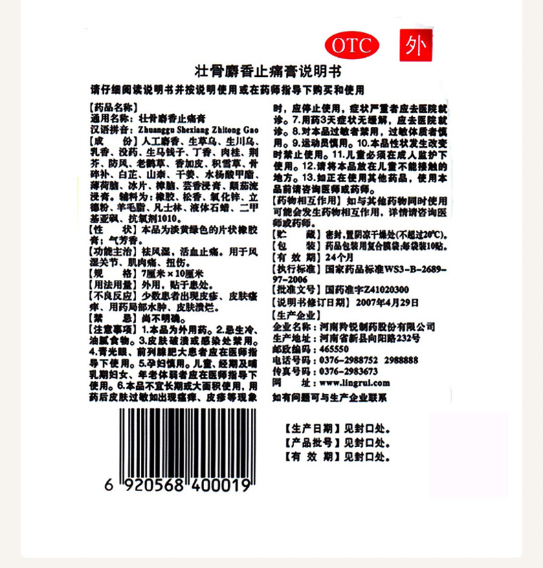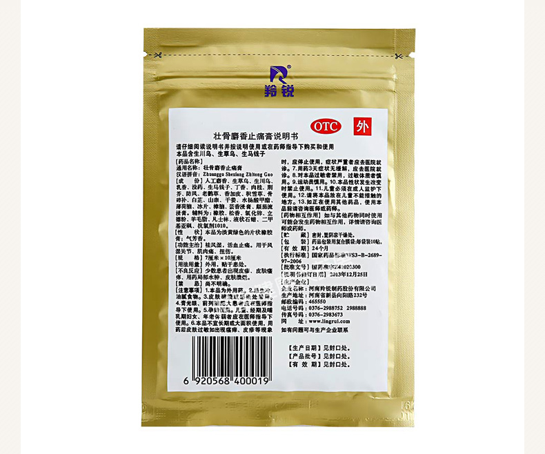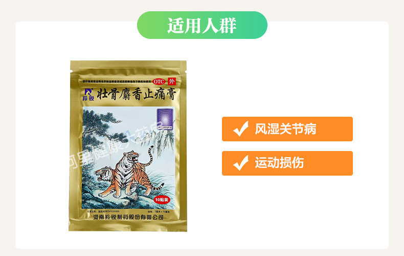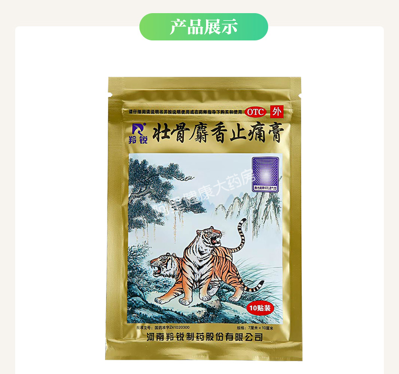 这款羚锐壮骨麝香止痛膏主要成分豹骨、麝香、生草乌、生川乌、乳香、没药、冰片、樟脑、薄荷脑、芸香、颠茄流浸膏、水杨酸甲酯等24味中药材,能祛风湿,活血止痛。用于风湿关节、肌肉痛、跌打扭伤。