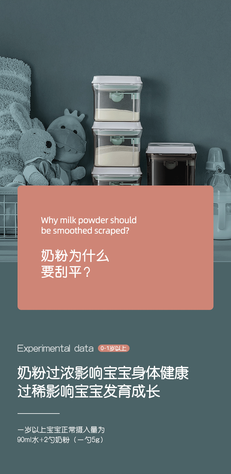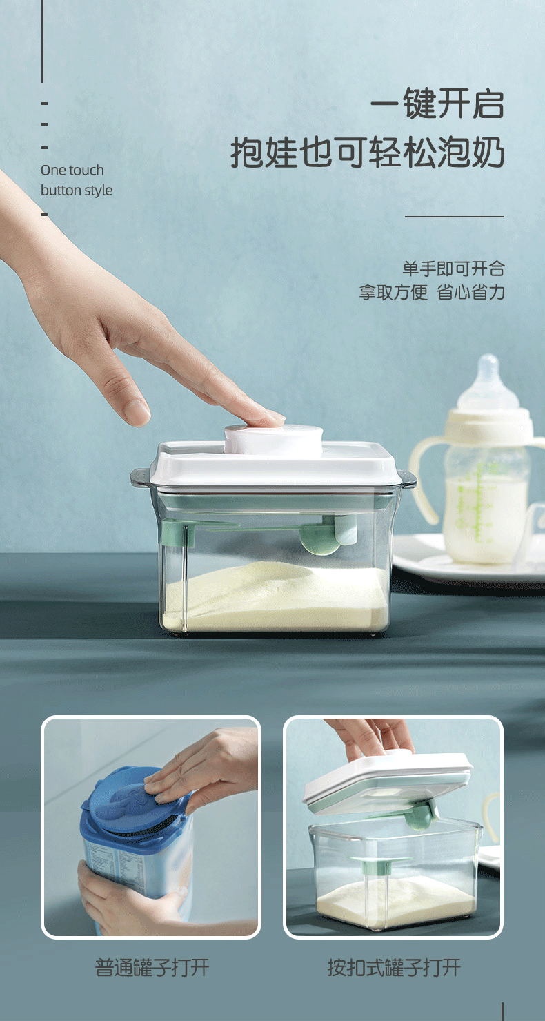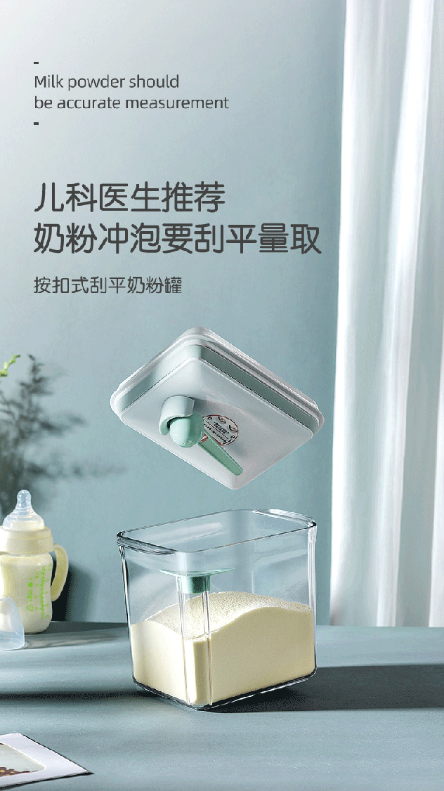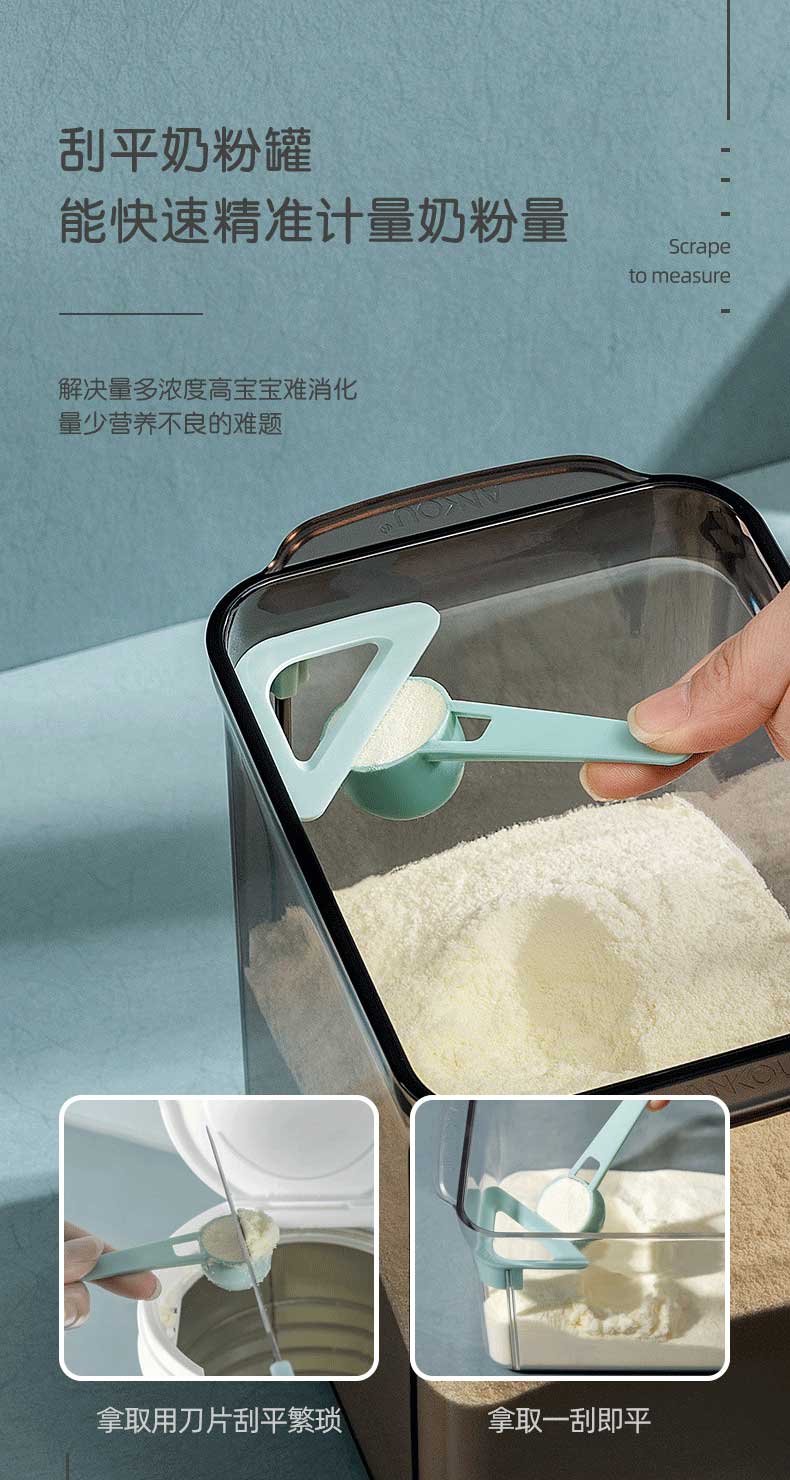 这款安扣 按扣式刮平密封奶粉罐,单手一键启闭,有效解决了开盖繁琐和密闭性差的问题。有刮平量取设计,奶粉过浓影响宝宝身体健康、过稀影响宝宝发育成长,需要精准量取。