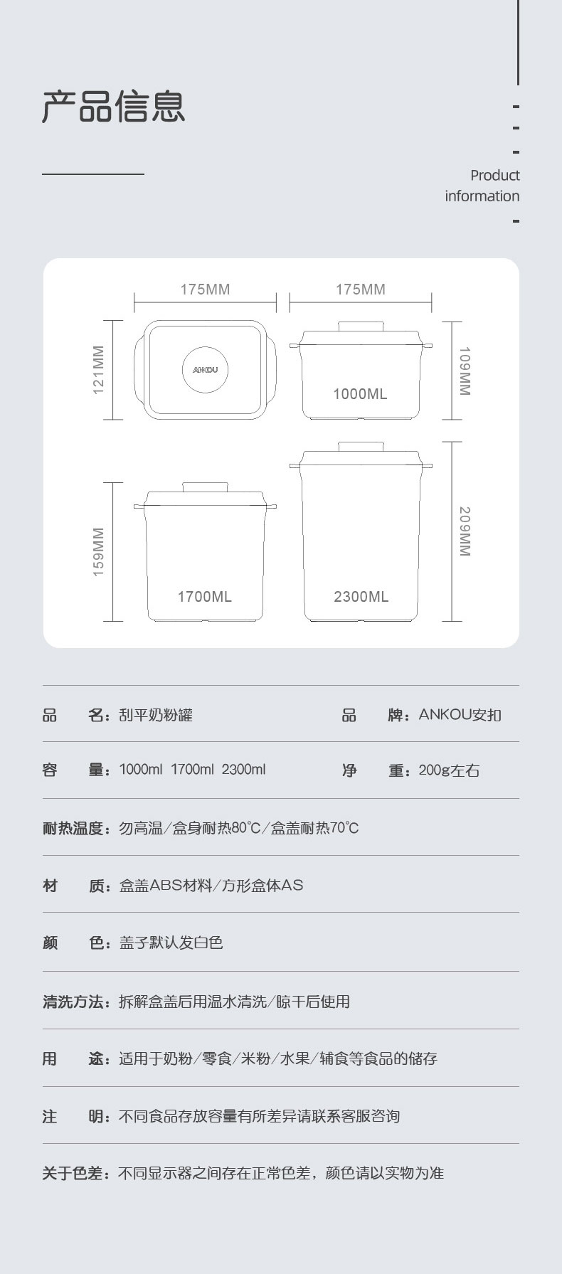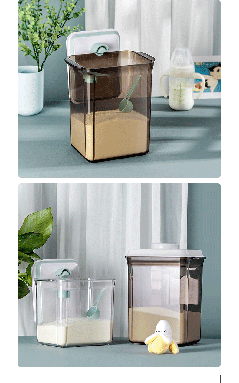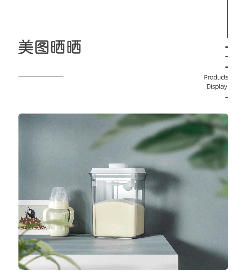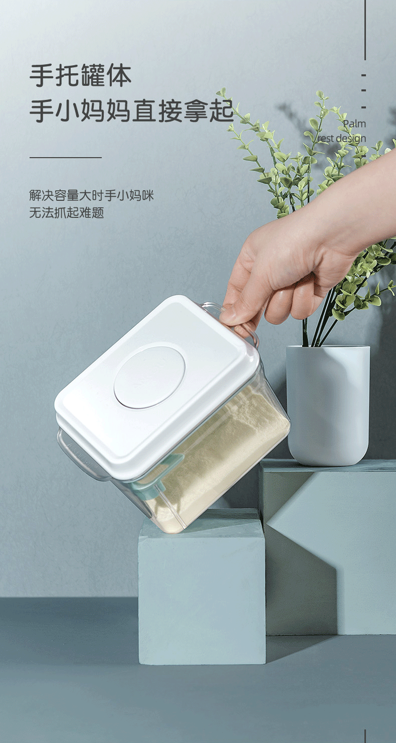 这款安扣 按扣式刮平密封奶粉罐,单手一键启闭,有效解决了开盖繁琐和密闭性差的问题。有刮平量取设计,奶粉过浓影响宝宝身体健康、过稀影响宝宝发育成长,需要精准量取。