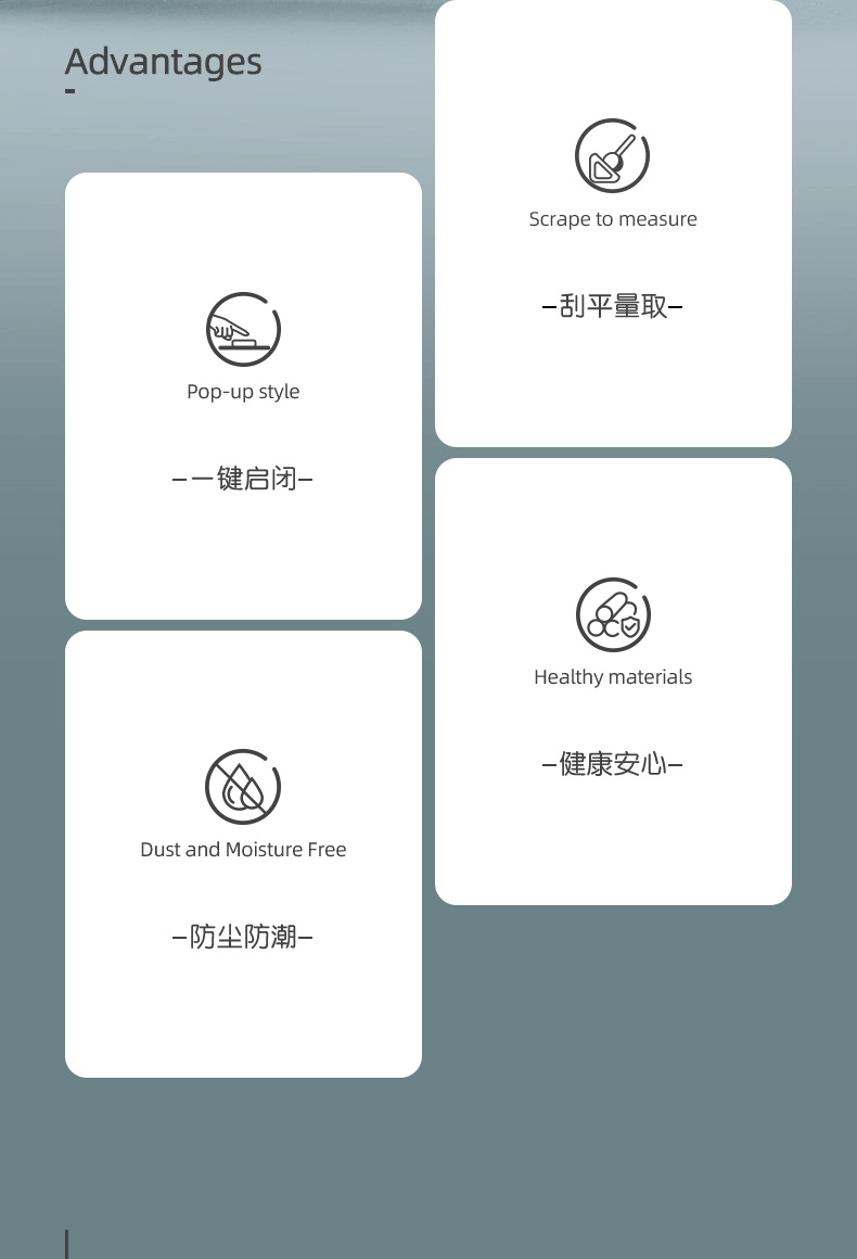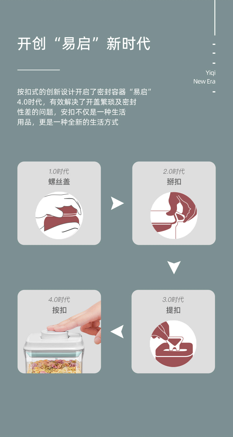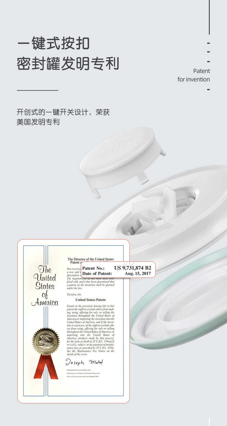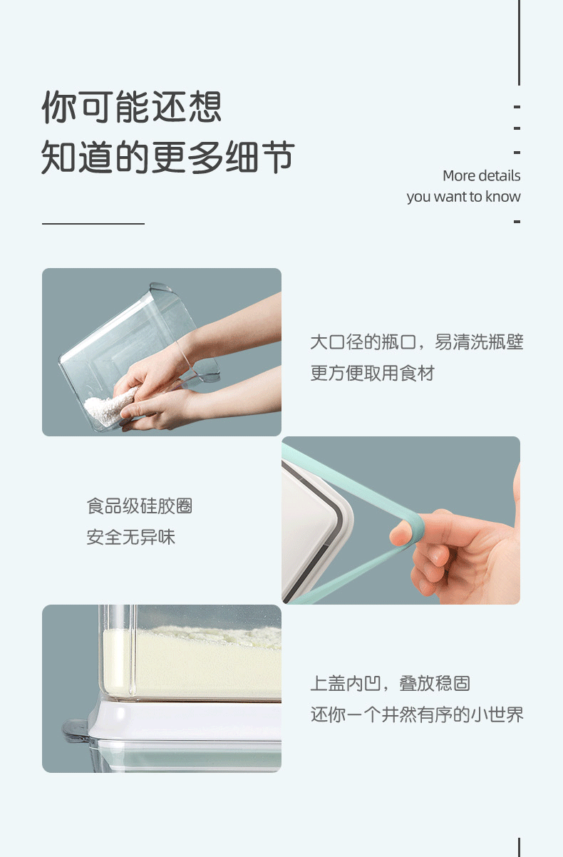 这款安扣 按扣式刮平密封奶粉罐,单手一键启闭,有效解决了开盖繁琐和密闭性差的问题。有刮平量取设计,奶粉过浓影响宝宝身体健康、过稀影响宝宝发育成长,需要精准量取。