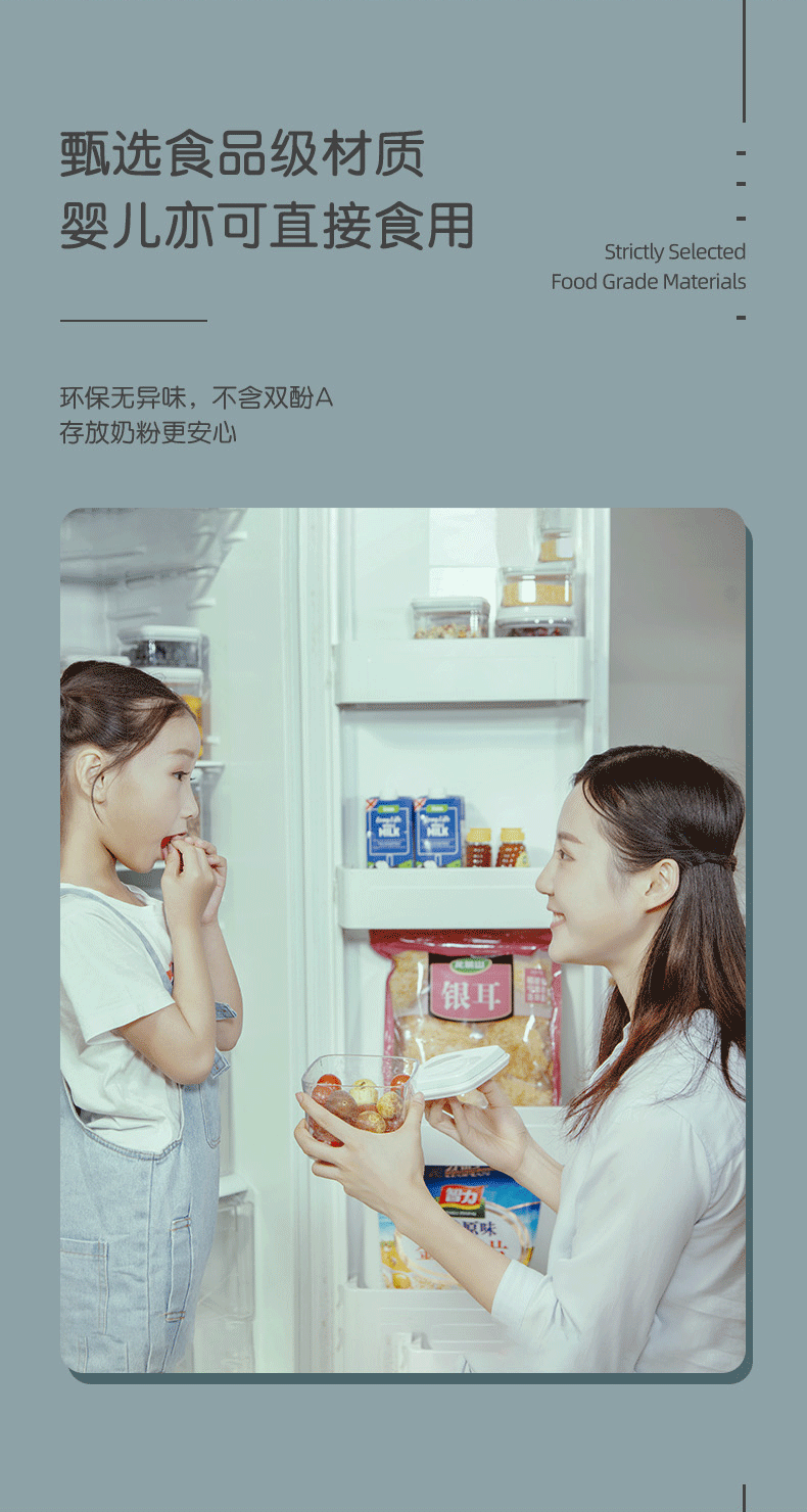 盒子本身使用环保无异味的食品级材质制成,符合美国食品级FDA标准,不含双酚A、荧光剂,可以放心储存奶粉,