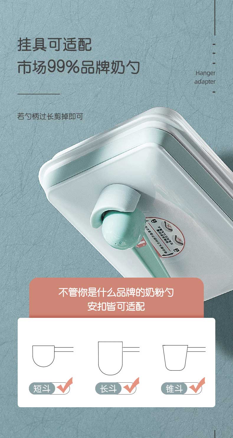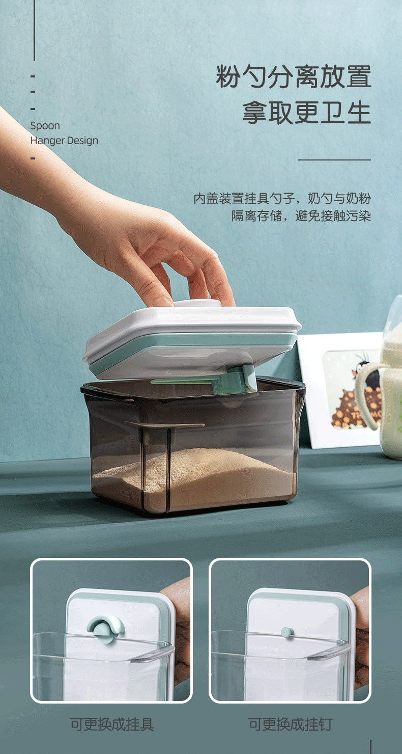 粉勺分离放置,内盖装置挂具勺子,奶勺与奶粉隔离存储,避免接触污染,拿取也更卫生。