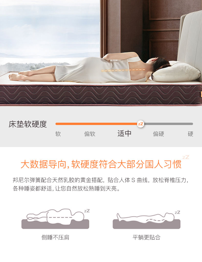 搭配泰国进口乳胶,蜂窝透气高回弹,有效释放人体脊椎压力,除菌更环保!核心支撑系统配备万向平衡技术,10倍支撑点,为人体提供全面有效的支撑,护脊+1°,面料采用天丝面料,亲肤透气,经典滚边设计,时尚有品味。