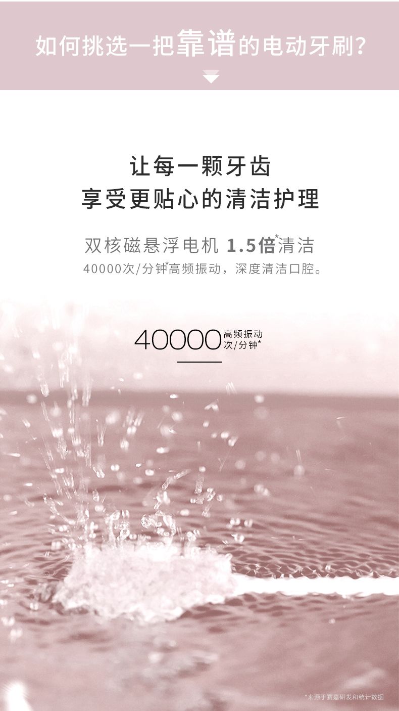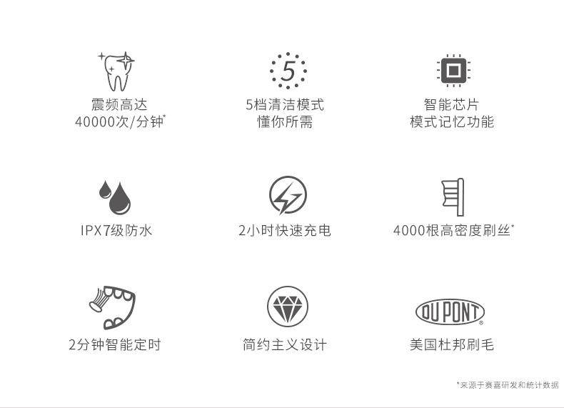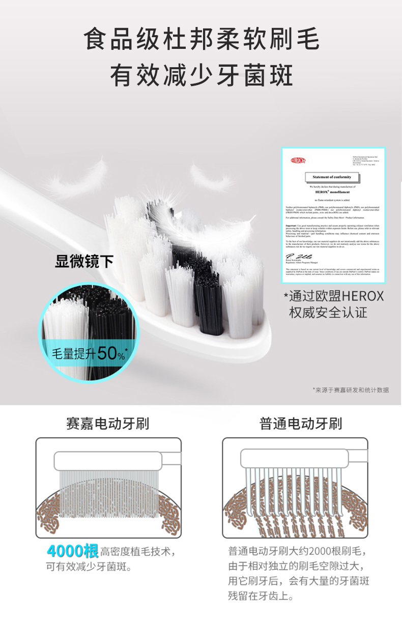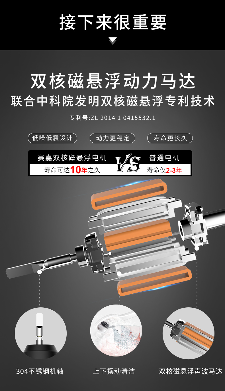 这款赛嘉电动牙刷,采用联合中科院发明专利的,双核自悬浮动力马达,最高可达40000/分高频震动,刷毛采用美国杜邦刷毛,能深层清洁口腔,可击碎牙结石,有效清除清除牙菌斑等。牙刷顶端磨圆,轻柔护齿,不伤害齿面和口腔。