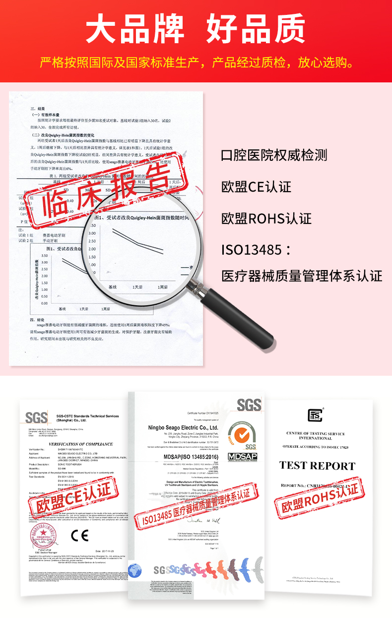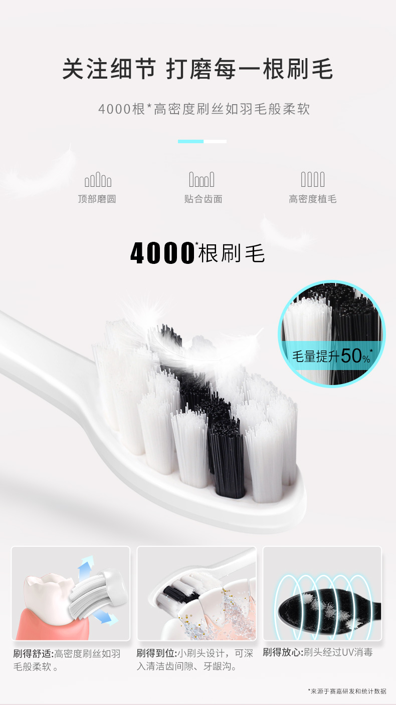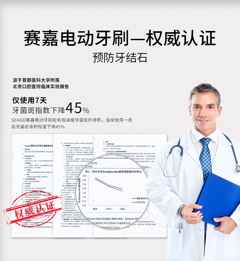 这款赛嘉电动牙刷,采用联合中科院发明专利的,双核自悬浮动力马达,最高可达40000/分高频震动,刷毛采用美国杜邦刷毛,能深层清洁口腔,可击碎牙结石,有效清除清除牙菌斑等。牙刷顶端磨圆,轻柔护齿,不伤害齿面和口腔。
