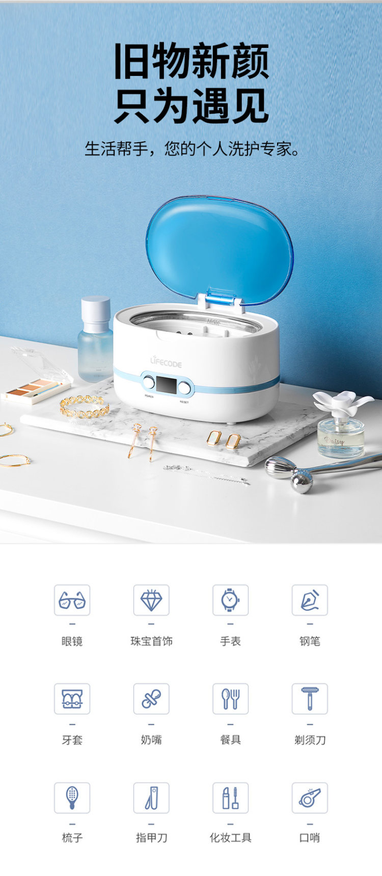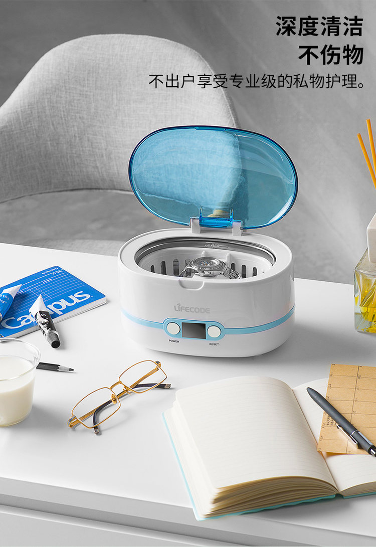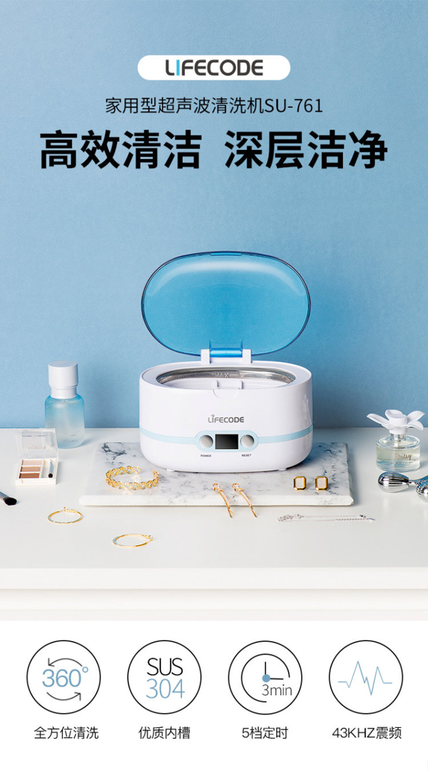 LIFECODE 莱科德 SU-761 超声波清洗机,最高可实现每秒43000hz高频震动,轻松达到清洁杀菌的目的,配备有5档定时调控,用户可根据需求自由设定。产品可以用来洗眼镜、洗奶瓶、洗首饰、剃须刀等容易附着微小污渍的生活小配件。