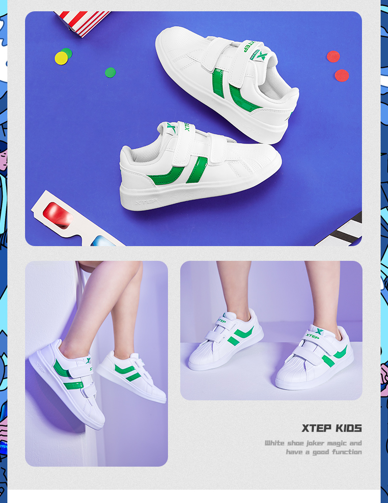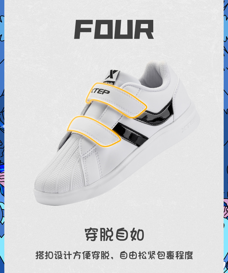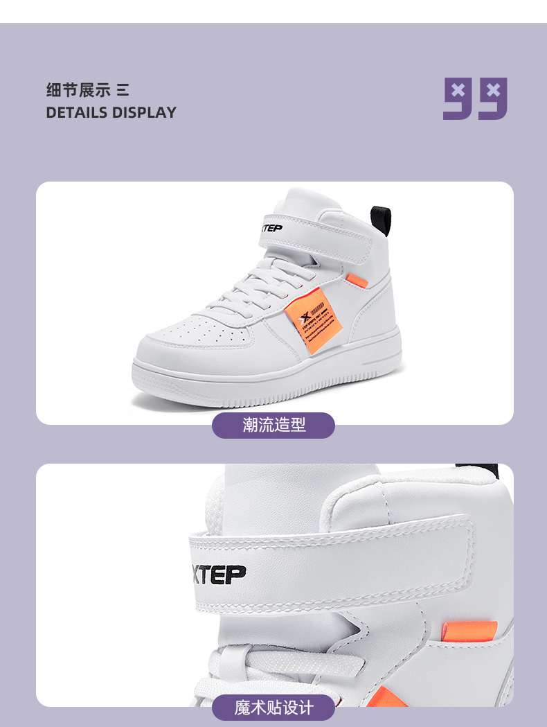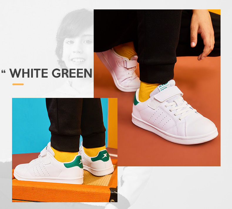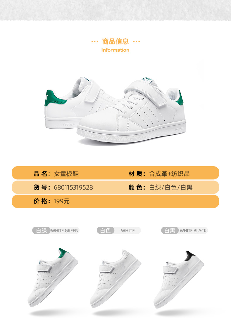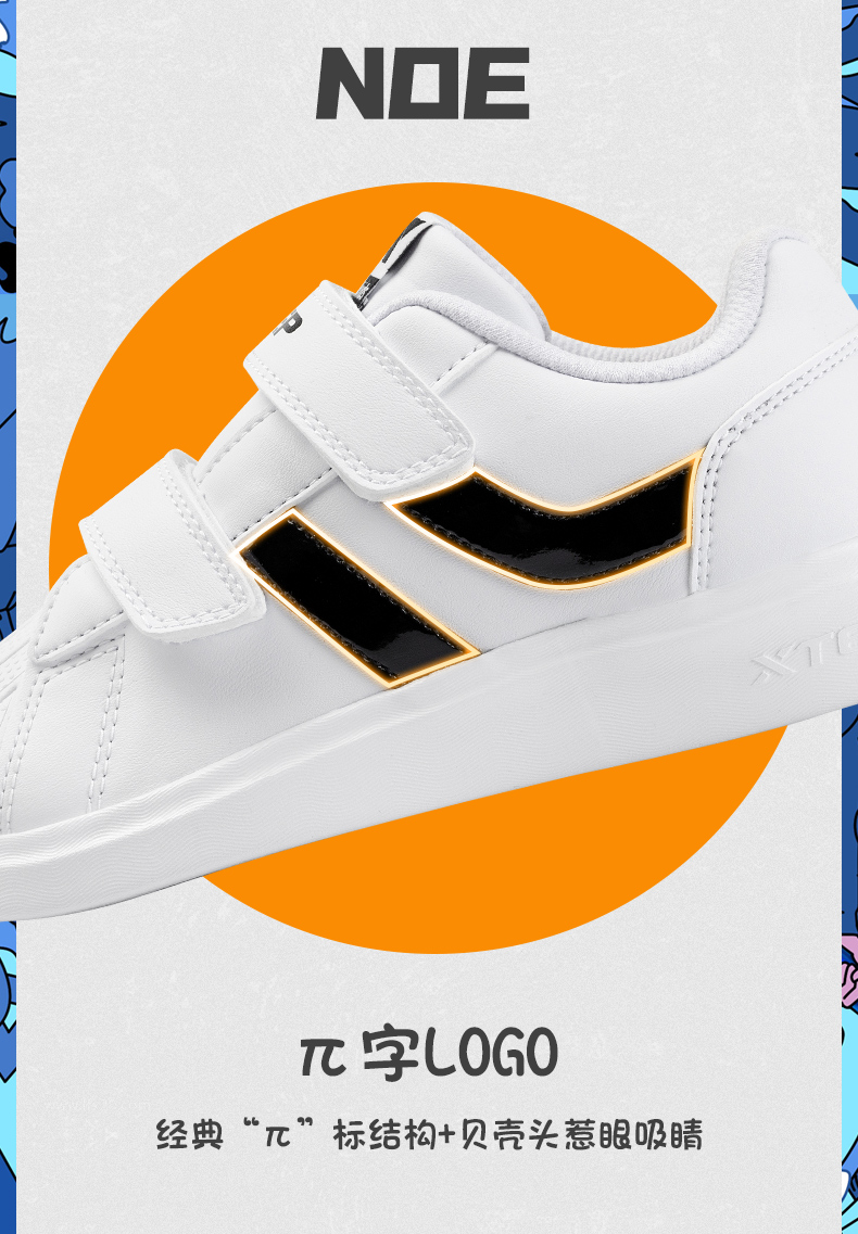 这款特步儿童休闲板鞋是2020年秋季新款,经典小白鞋造型,在款式上类似阿迪的Stan Smith,贝壳头+尾标的组合,很帅气有没有。