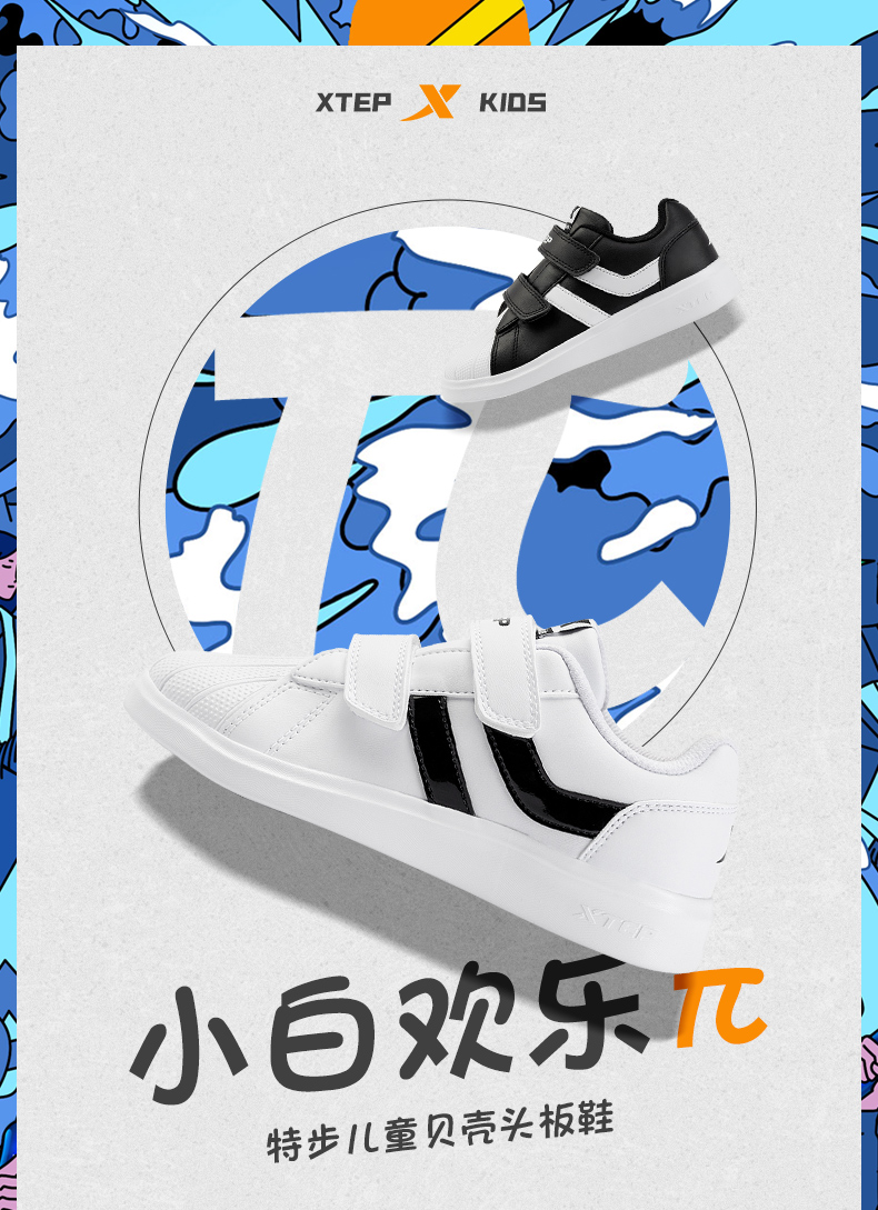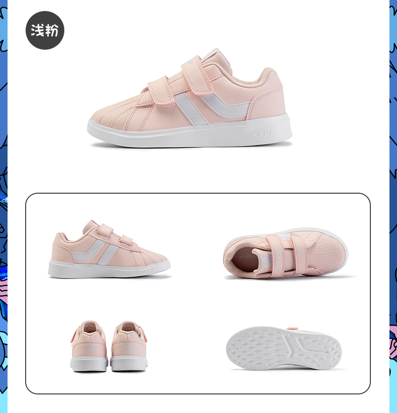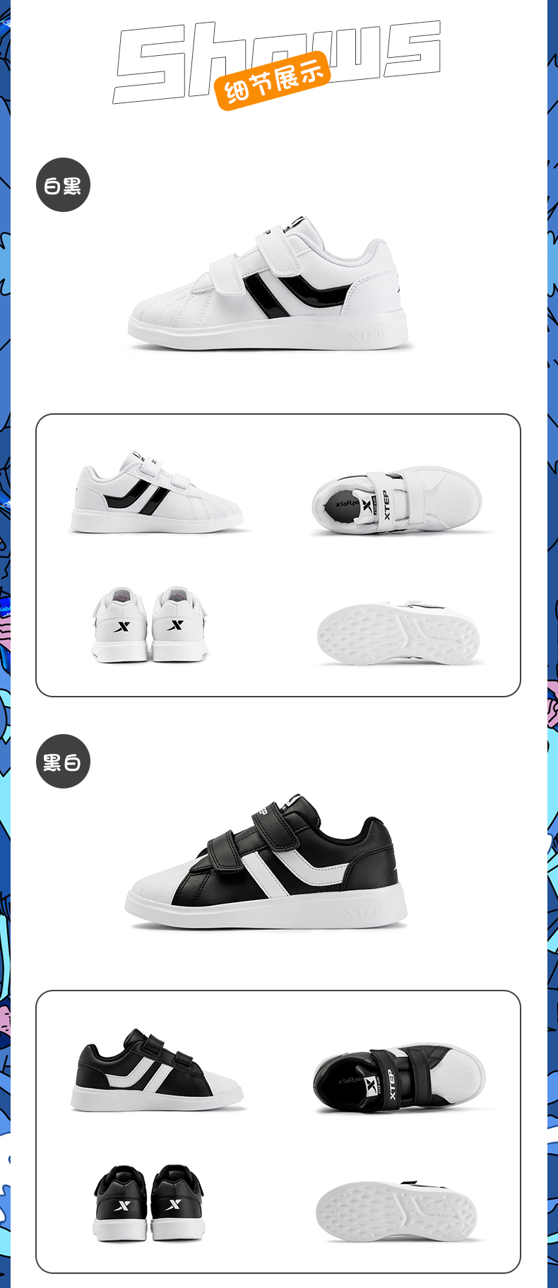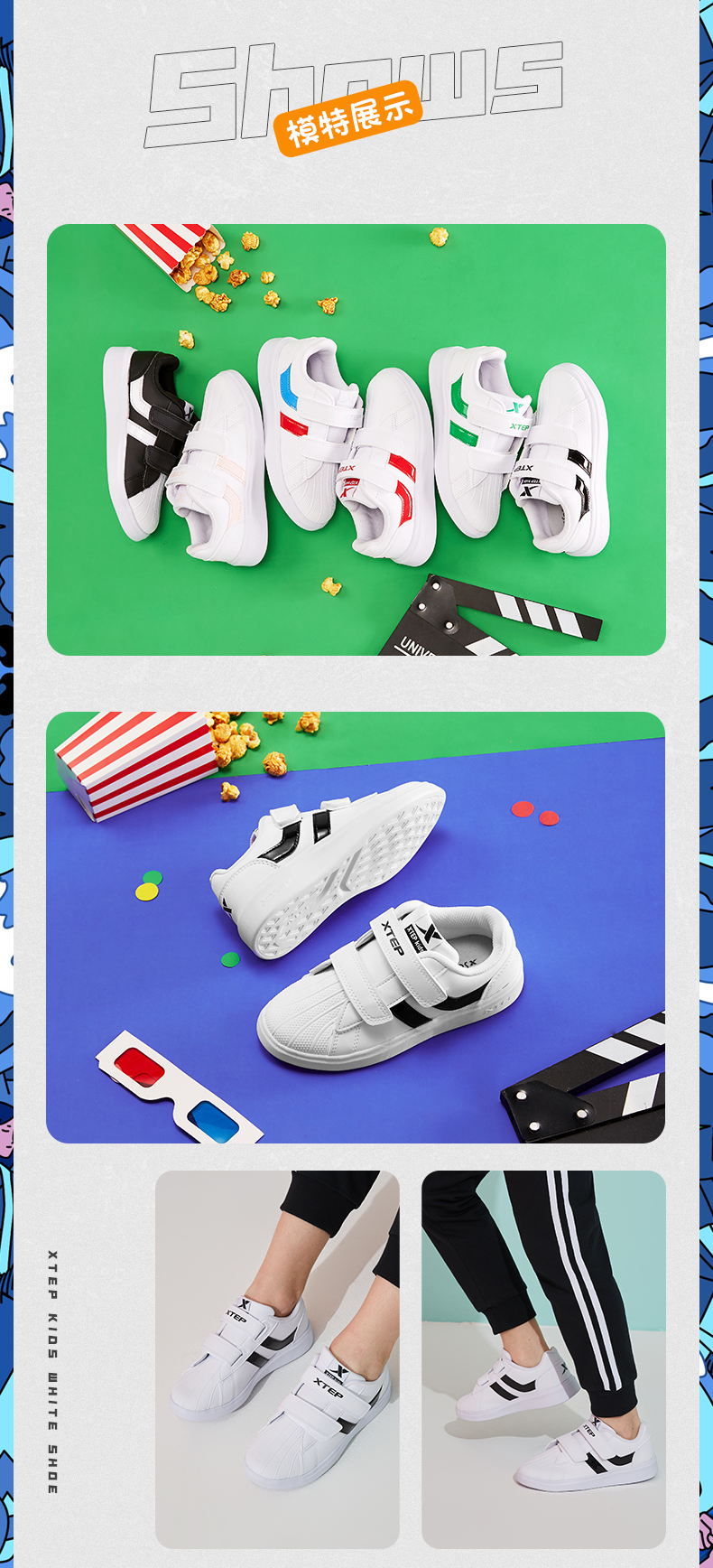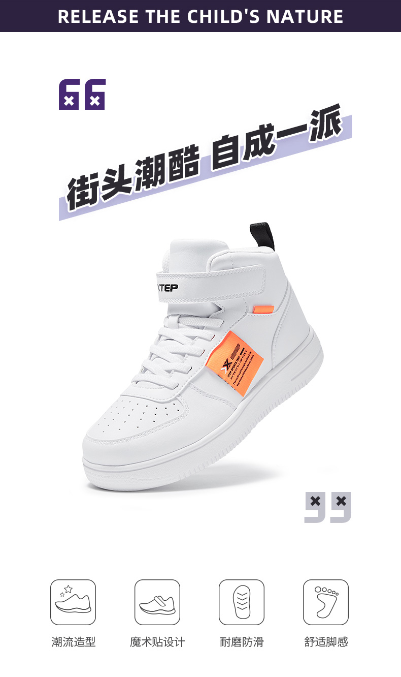 这款特步儿童休闲板鞋是2020年秋季新款,经典小白鞋造型,在款式上类似阿迪的Stan Smith,贝壳头+尾标的组合,很帅气有没有。