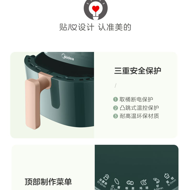 这款美的 无油全自动空气炸锅,9叶强劲风扇,360°热空气高速循环逼出食物油脂,锁住汁水和营养,外酥里嫩,拒绝夹生口感不一, 每一口都酥嫩。3L大容量全家享,装得下约一只整鸡、8只鸡翅根、5个蛋挞,欢乐开趴敞开吃。内置微动开关,炸篮取出,机器暂时停止运作,放入后自动恢复,安全省心。旋定时操作,坐享健康美食。不粘材质达到GB和FDA卫生安全标准,既保持食材完整,也更易清洁。