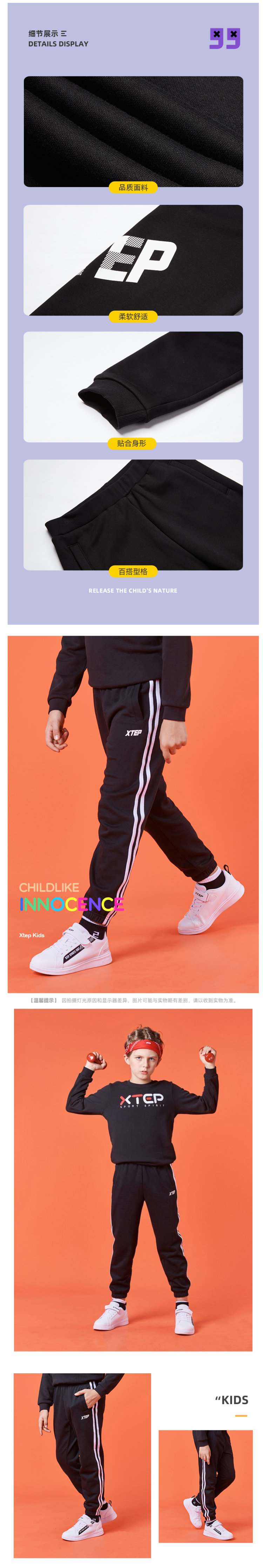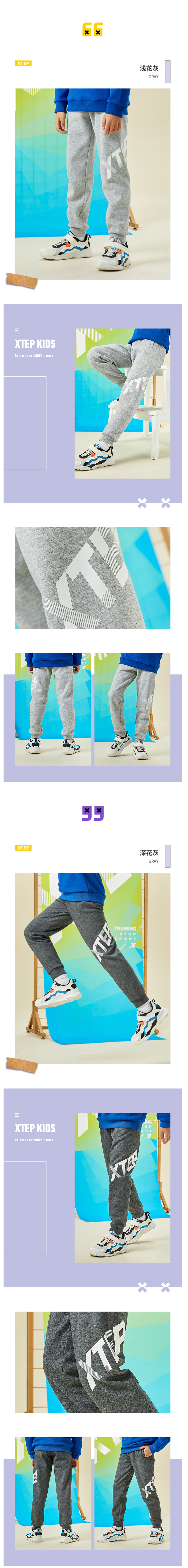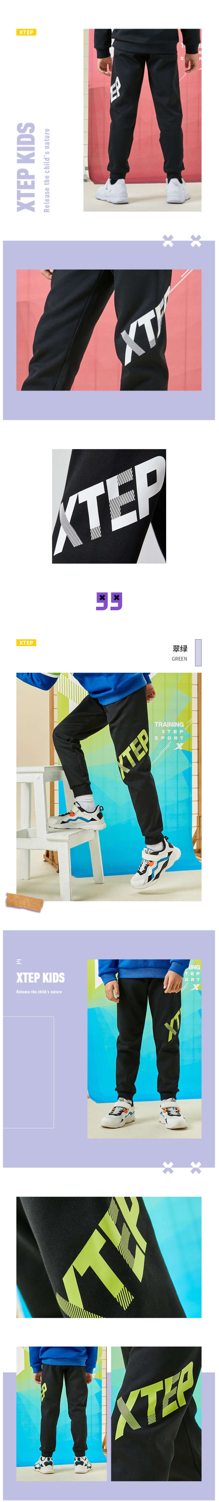 这款特步儿童加绒运动裤,是2020年秋冬新款,采用65%聚酯纤维+35%棉混纺而成,厚度中等,内里拥有接近纯棉的轻柔手感和舒适度,面料质地轻盈,透气舒适。弹力裤腰、罗纹裤脚,裤面上还有XTEP的印花。