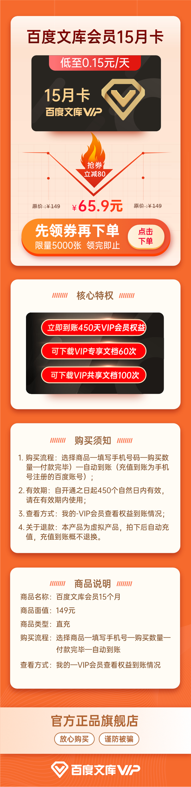 天猫百度文库旗舰店145.9元,可领80元优惠券,实付65.9元到手,到账15个月,平常149元/年。