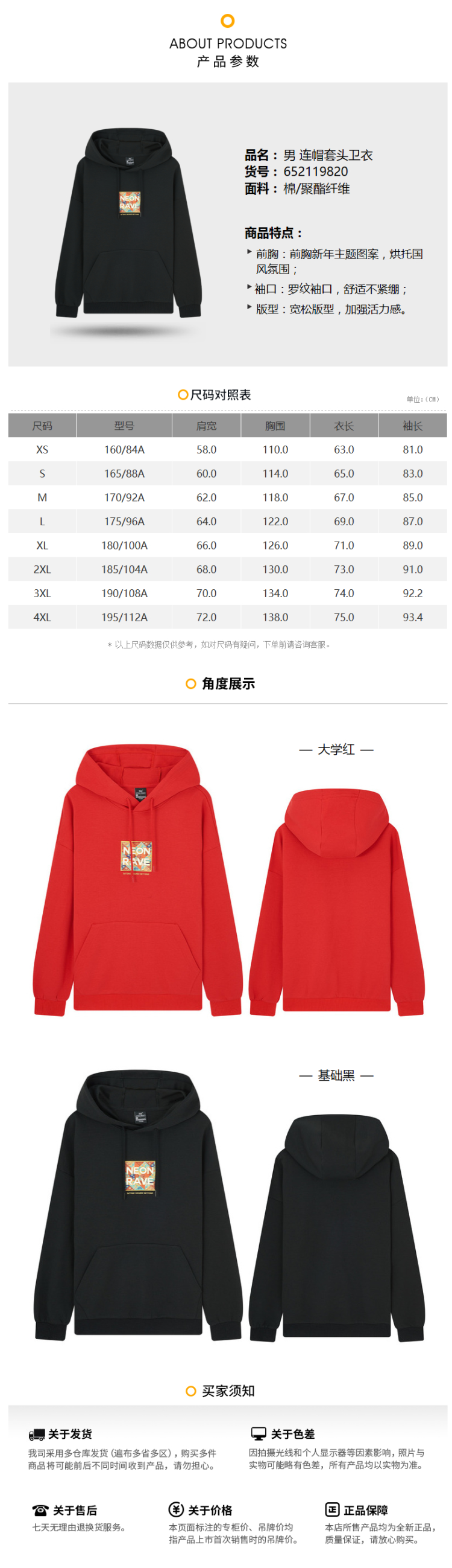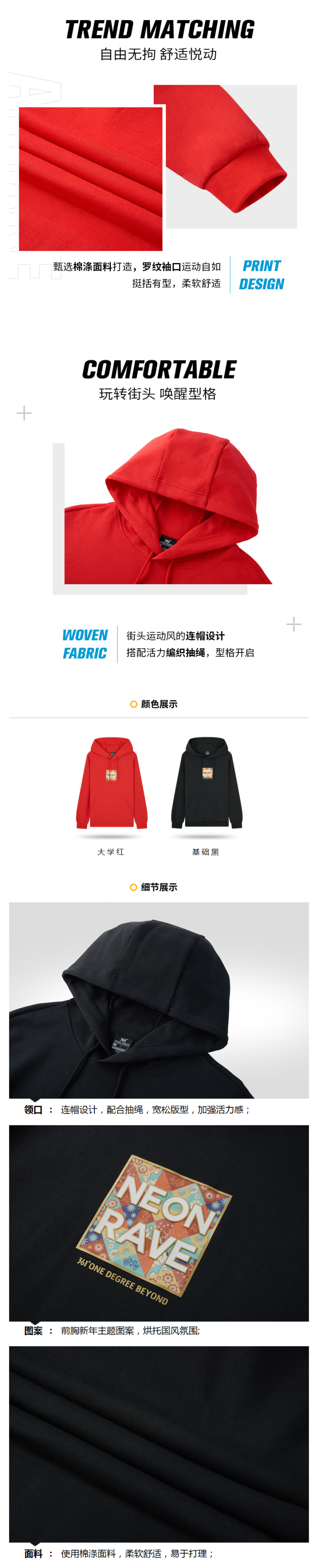 在款式上,经典连帽卫衣设计,宽松版型,不挑身形都能穿,前胸是新年主题图案,烘托国风氛围;简约大气罗纹领口和袖口,贴合舒适不紧绷。