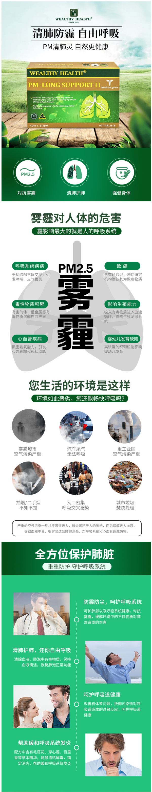 这款Wealthy Health 净肺片,澳洲原产,主要作品是帮助清理肺部有害物质、祛烟毒、抗雾霾,降解有害物质,调节免疫系统,帮助祛痰、降低气喘、清肺护肺等,尤其适合常年抽烟、肺部不适、雾霾影响等人群。