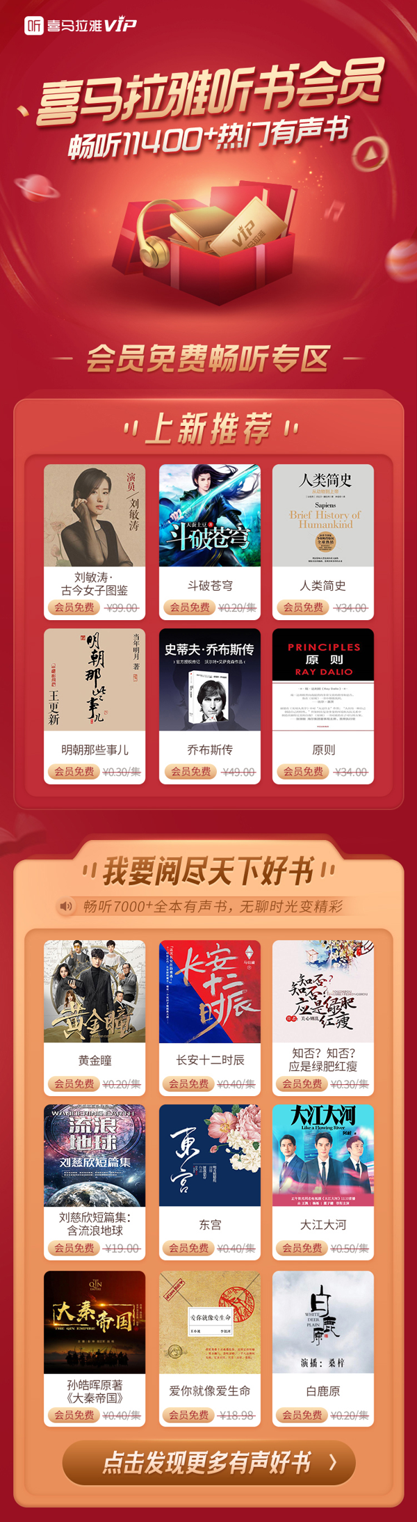 喜马拉雅VIP会员年卡包含174本经典书籍,28本付费费课程,2017本有声小说。天天好书畅听,每日更新,全年超过500本好书精华梳理。精选有声书免费畅听,畅听库已经覆盖90%,可每月可获得总价价值80元的4张专辑通用券,购买专辑还可以做到9.5折。