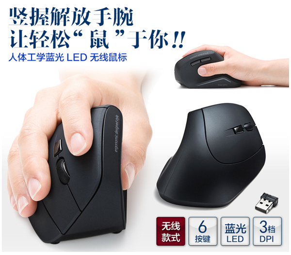 这是一款垂直鼠标,跟传统鼠标的区别在于可以自然贴合手掌,长时间使用不会觉得累,告别鼠标手,采用蓝光LED引擎,相较于红光鼠标波长更短,精度也就更高,在不完整甚至粗糙的平面上也能精准指向,多键位设计,还增加了前进和后腿键位,办公浏览网页时更加方便。