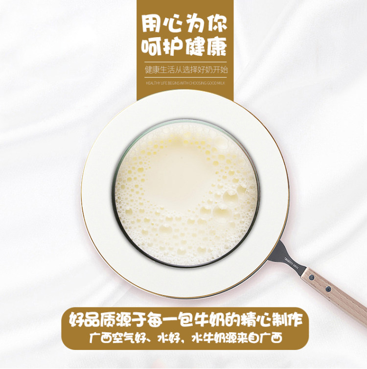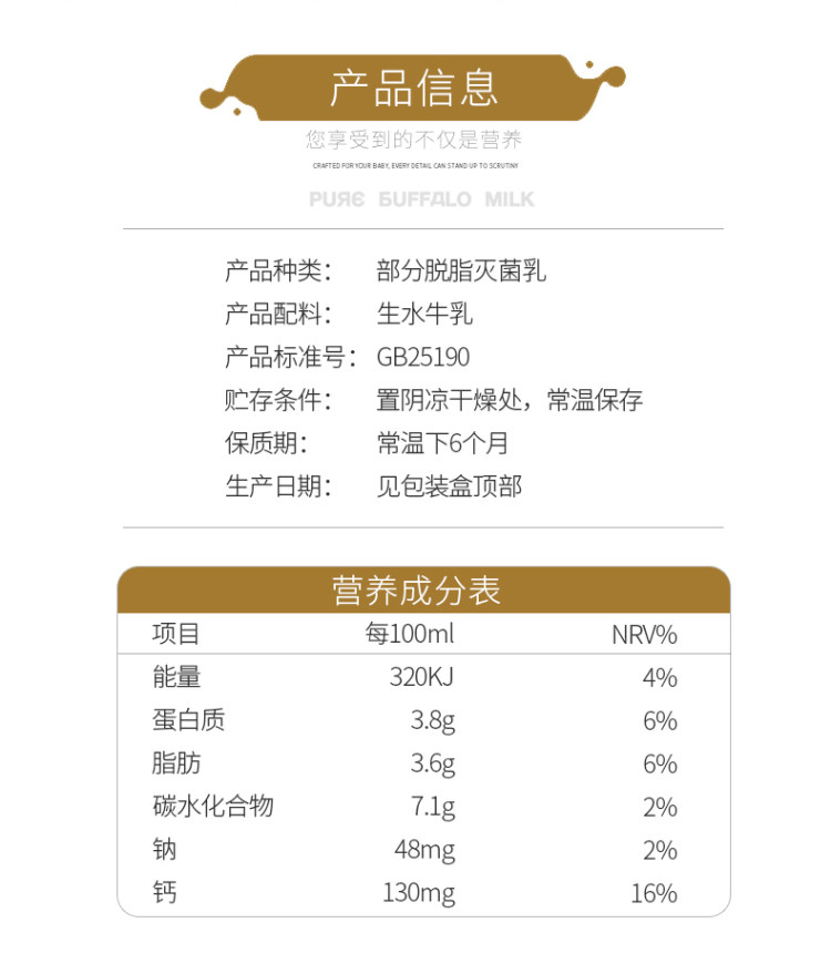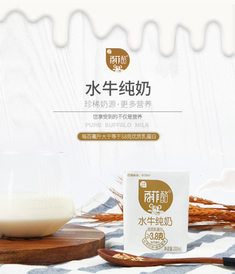 水牛奶,与人们熟知的乳用牛产的奶不同,水牛奶产量较低,营养价值高,适宜儿童生长发育和抗衰老的锌、铁、钙含量高,维生素含量丰富,很多人熟悉的姜撞奶、双皮奶是由水牛奶来制作。口感清醇而不油腻,非常适合对牛能味道高的人群。