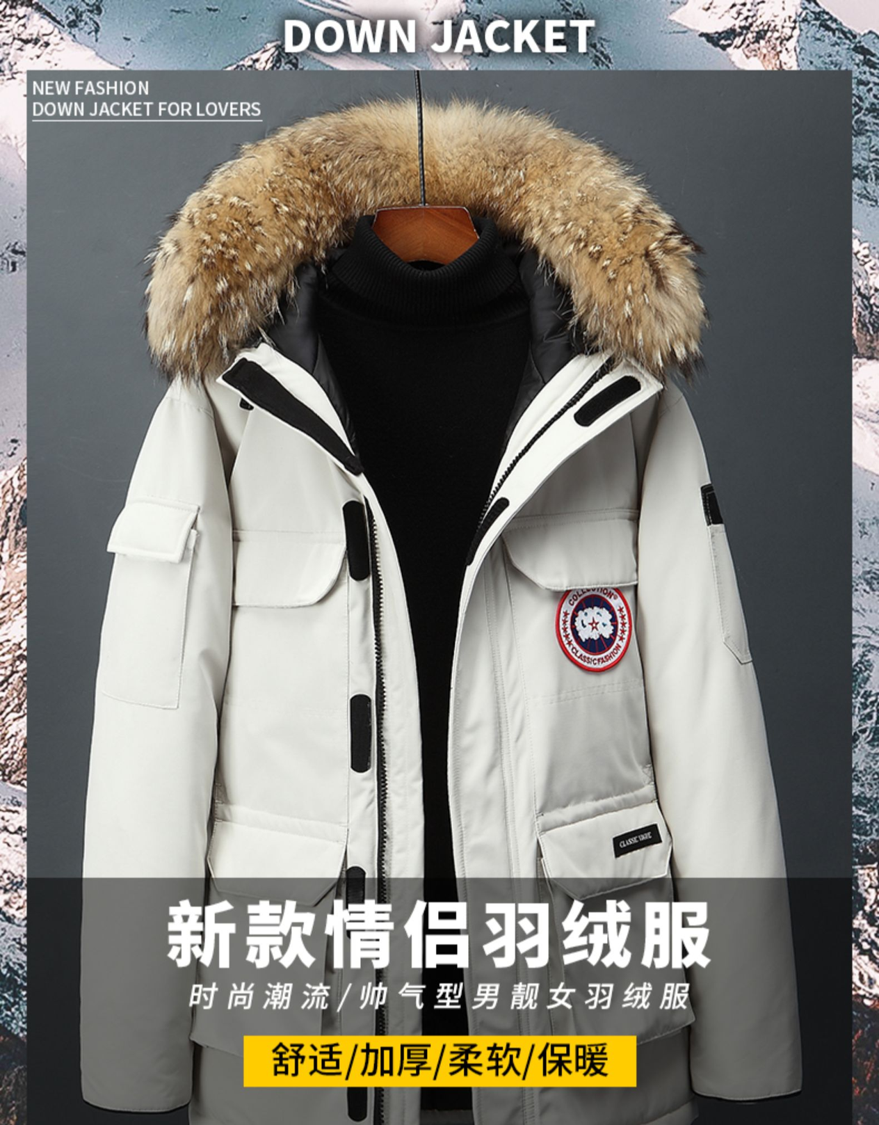 这款南极人 加厚大毛领连帽羽绒服,优选高密度面料,内里90%白鸭绒填充,舒适保暖,四层结构防钻绒,安全耐穿。连帽设计,立体毛领,有型休闲,简约保暖,正面多口袋设计,有型插袋搭配粘贴,实用美观,弹力袖口,贴合手腕,手臂口袋设计,个性潮流。