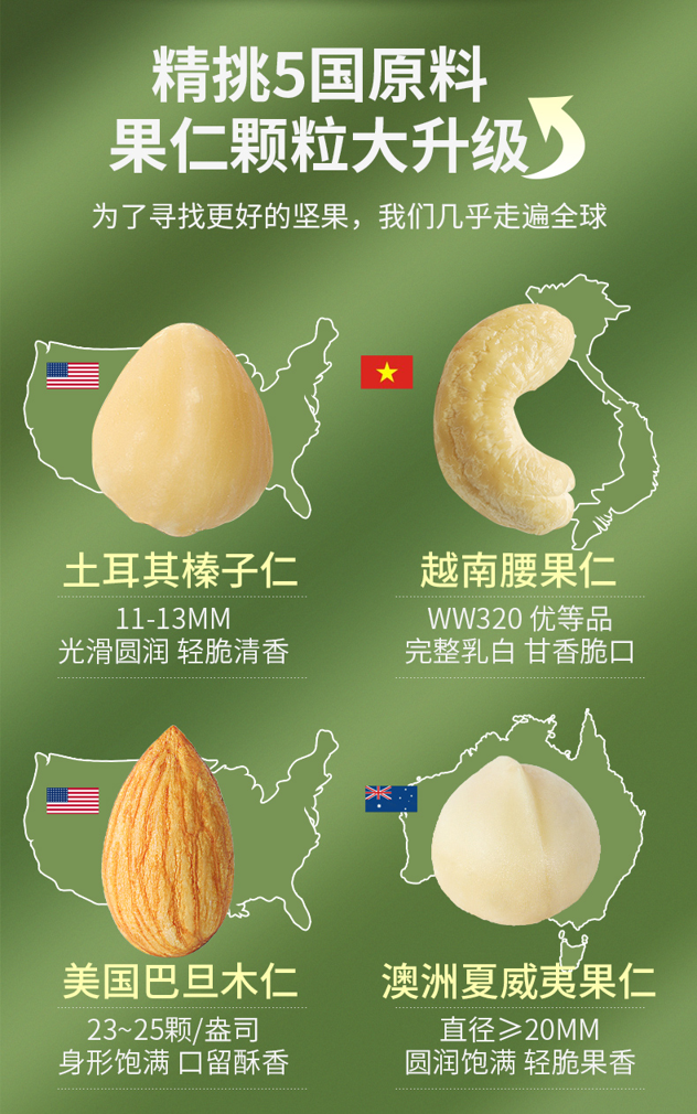 包含:土耳其榛子仁 11-13mm、越南腰果仁WW320优等品、美国巴旦木仁23-25颗/盎司、澳洲夏威夷果直径≥20mm、中国核桃仁、美国开心果21-23颗/盎司