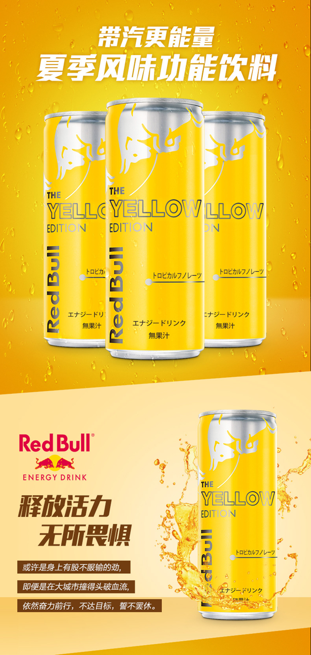 这款红牛能量饮料,产地瑞士,全新热带风味,精美黄色罐身视觉与味觉的双重享受。采用经过阿尔卑斯山的冰泉水为原料,富含精氨酸、咖啡因、葡萄糖,和丰富的维生素B6和B12等多种微量元素,在代谢油脂,碳水化合物和蛋白质方面,扮演者重要角色;随时随地来一罐可补充能量,保持头脑清醒,适合经常加班、熬夜、长时间驾车人群,可解除疲劳,提升精神。