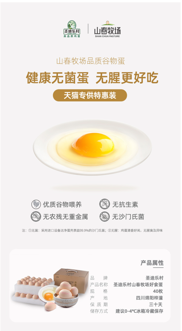 圣迪乐村是国宴峰会指定的蛋品供应商,采用德国罗曼种鸡,谷物喂养,每一个蛋品都可溯源,拒绝使用抗生素激素,同时引进MOBA设备,通过紫外线杀菌,至今未检出沙门氏菌,是放心安全的鲜鸡蛋,达到A级标准。