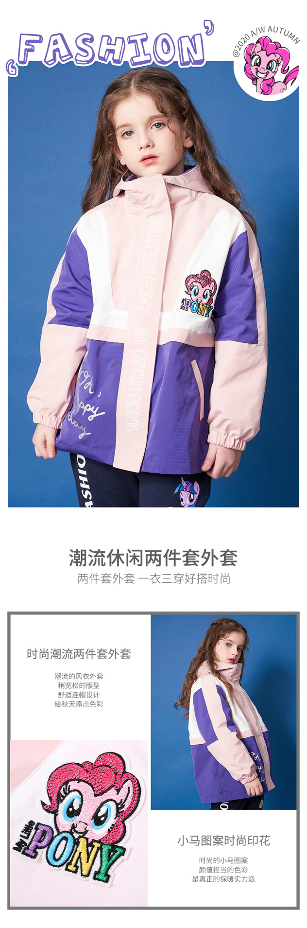 这款小马宝莉女童三合一冲锋衣,是2020年的秋冬新款,外层衣服采用100%聚酯纤维面料,表层还有防水膜,拥有不错的防风、防水效果。