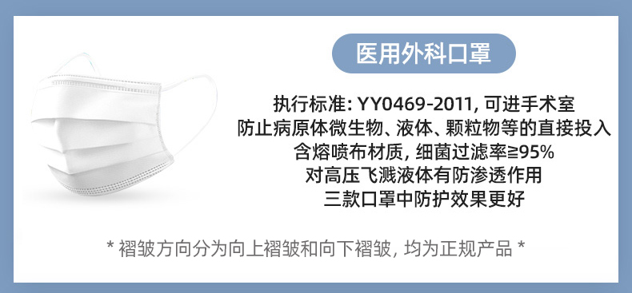 维德医疗 一次性医用外科口罩,执行标准号为YY0469-2011,二类医疗器械注册,经环氧乙烷灭菌,可进手术室级别,防止病原体微生物、液体、颗粒物等的直接投入,内外无纺布+熔喷布材质,细菌过滤率≥95%,对高压飞溅液体有防渗透作用。药监认证,医用品质。