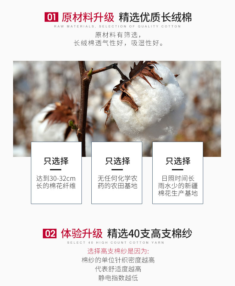 「长绒棉」属中高档但又没到顶级水准,是多数人买得起的好面料。长绒棉占全球棉产量3%,生长周期长,含油量高不易板结,可织成高支纱线,制成布料后,会有普通棉没有的丝般光泽,其柔软度、亲肤度、透气性、色牢度等均远超普通棉。