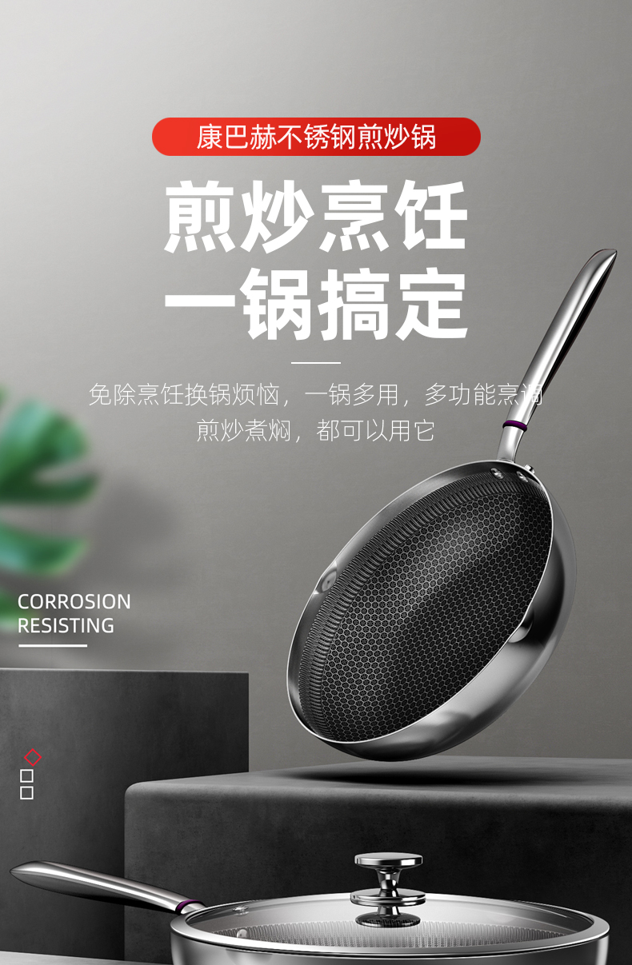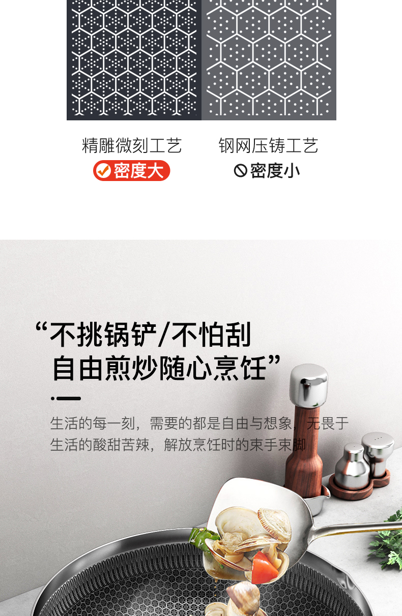 内层蜂窝纹理和精雕技术,不怕剐蹭,锅底不发黄,一擦即净,方便清理。锅底为双层储能基材,升温迅速且均匀,不挑炉灶,燃气灶、电磁炉等都适用。9.5cm锅深设计,煎炒蒸煮都能实现。把手与锅身为加固铆钉,坚固耐用。