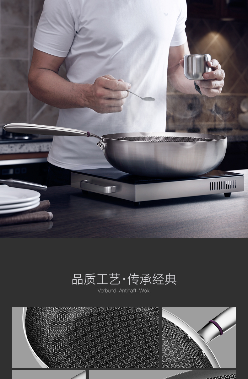 这款康巴赫不粘锅,采用比304不锈钢性能更加稳定的医用级316不锈钢,包括316不锈钢在内,共五层压铸而成。其中,内里采用高精微刻技术和蜂窝纹理全面覆盖,拥有国家发明专利技术,大幅度提高不粘特性,且少油烟。