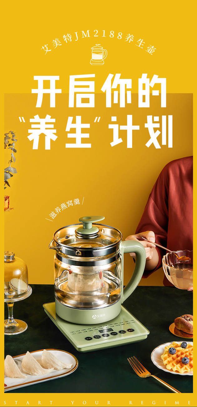 这款艾美特 多功能全自动养生壶,采用加厚高硼硅玻璃材质,能承受-20度~200度的温差变化,食品级304不锈钢发热盘,循环加热,1.8L大容量,满足6~8人的份量,24大功能智能触控面板,800W功率快速升温,缩短烹煮时间,萃取食物精华;具备一键除氯,24小时预约功能,此外还有提起记忆功能,即在工作状态提起水壶,1分钟内放回,将自动继续工作,无需重复设置。