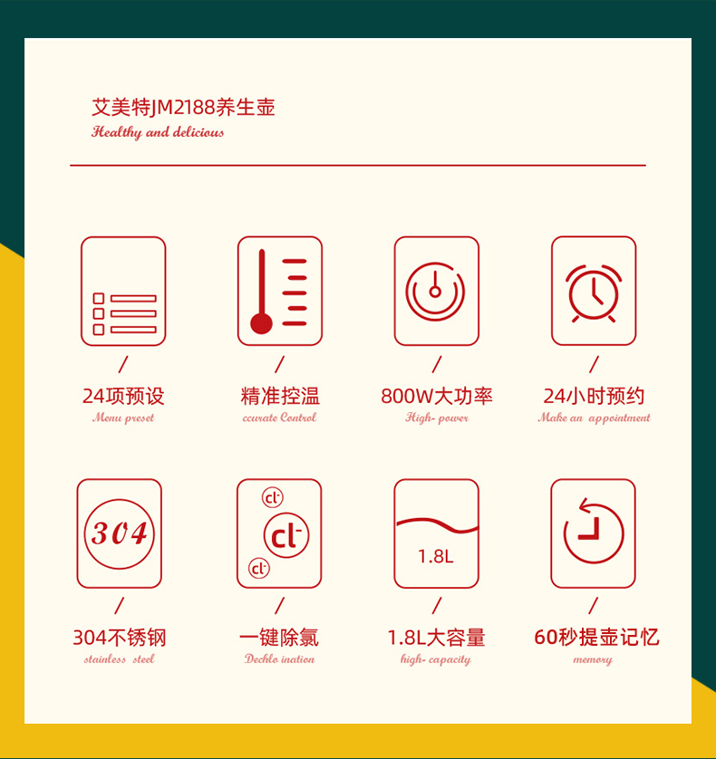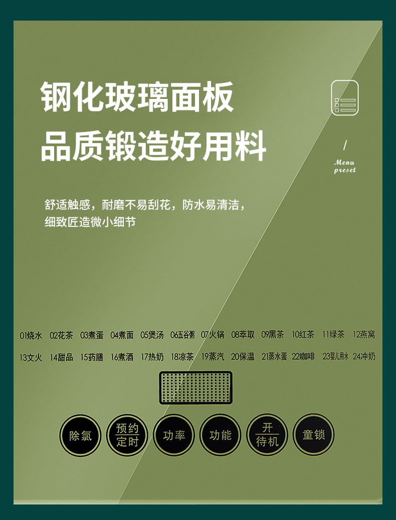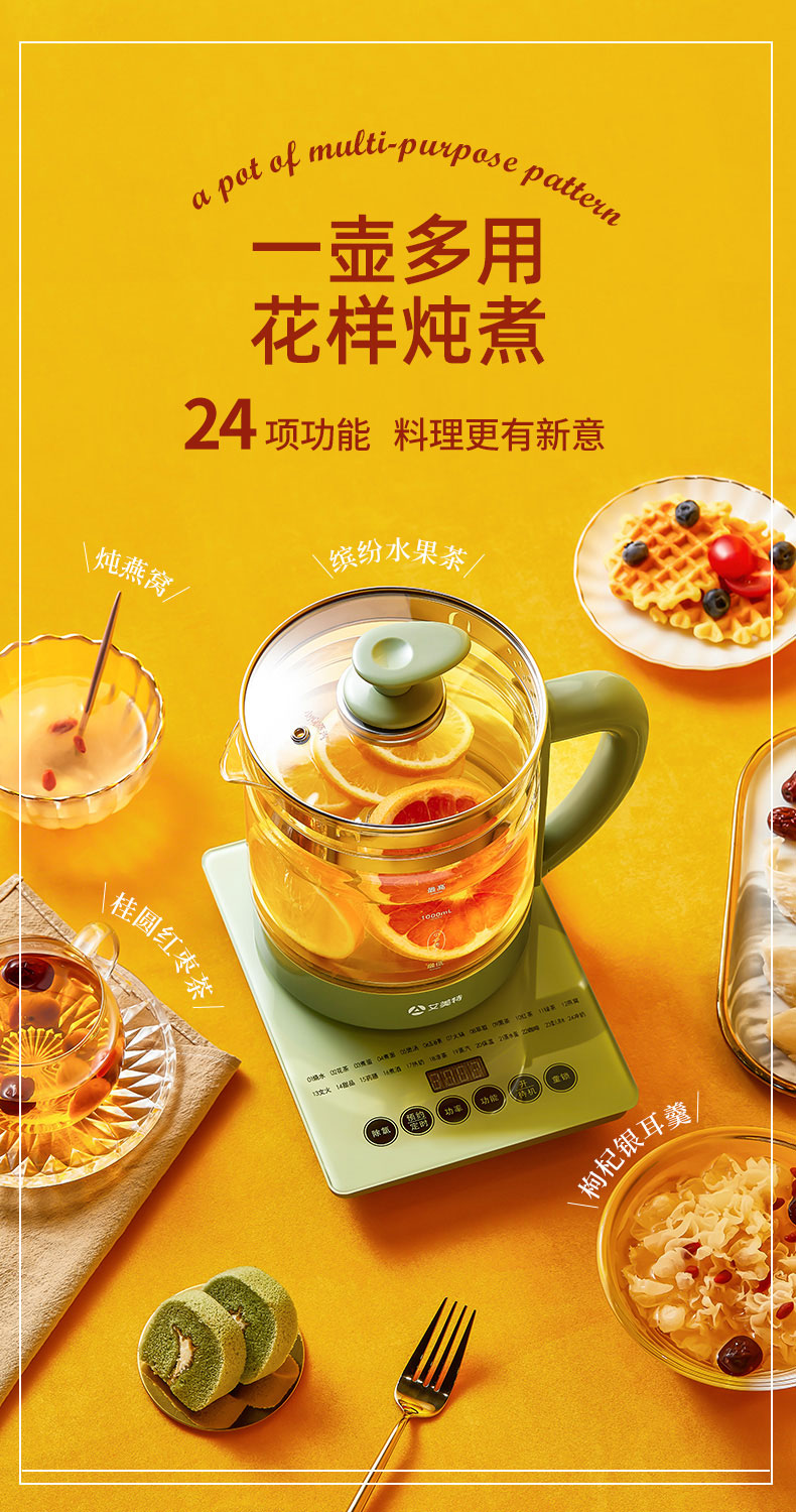 1.8L大容量,支持24H预约,高硼硅玻璃壶身,800W大功率,可一键除氯,60s提壶记忆,钢化玻璃操作面板,24项功能,一壶多用花样炖煮。