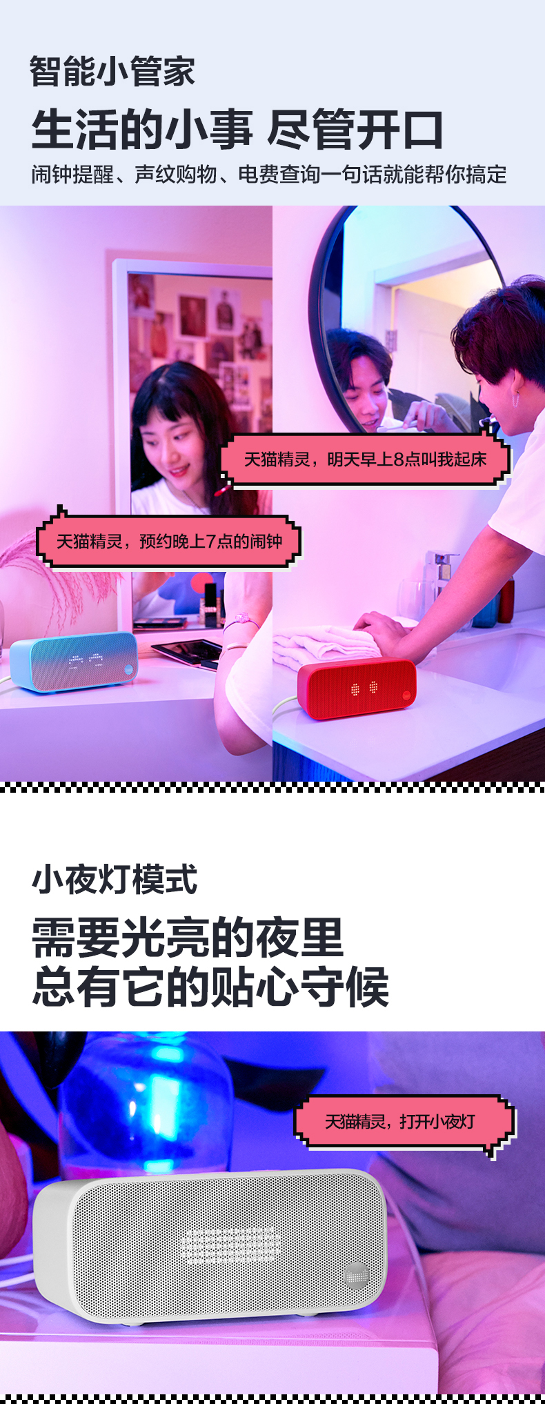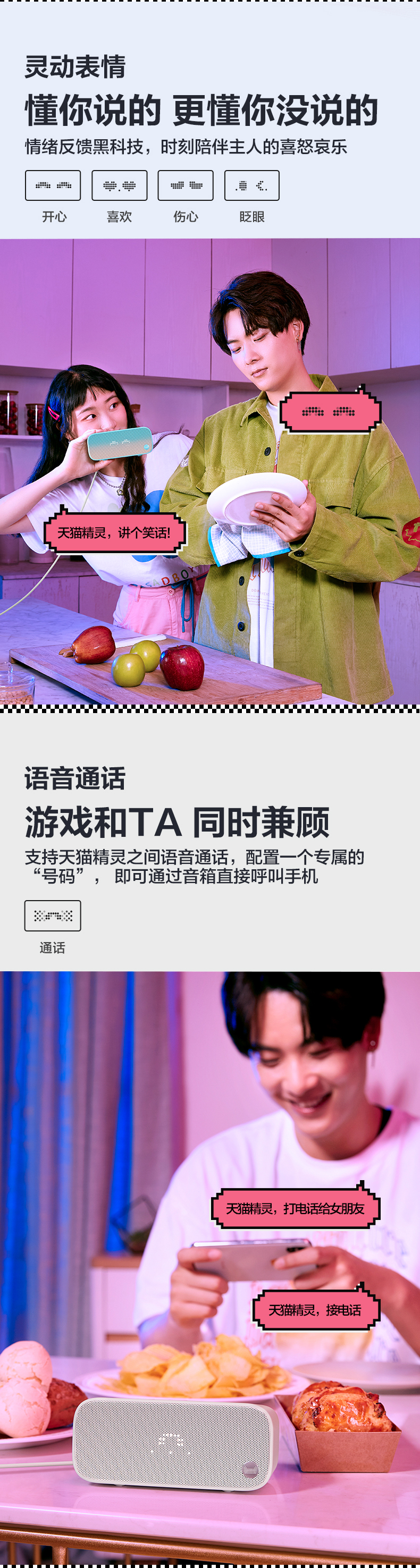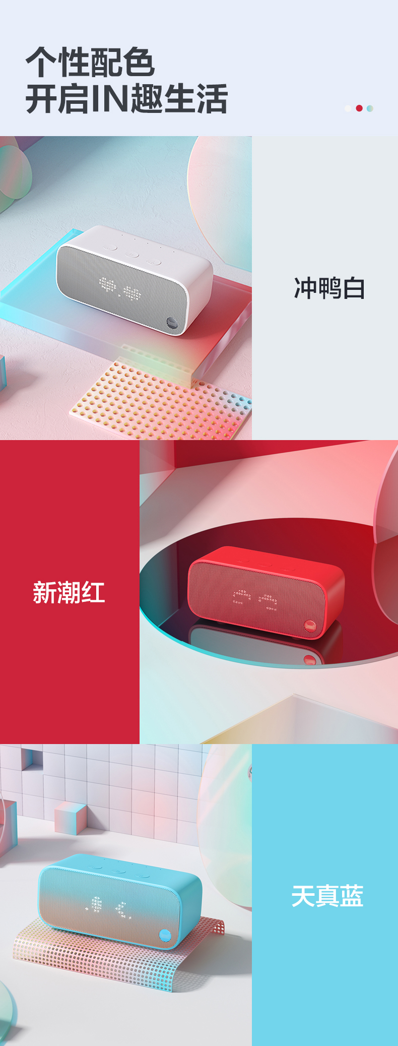 天猫精灵IN糖有新潮红、冲鸭白、天真蓝三款颜色,5x17白色LED点阵屏,具有灵动表情黑科技,用户对天猫精灵说的高频问题,天猫精灵IN糖会经过情感引擎的判断后通过点阵屏表现出开心、难过、惊讶、生气、烦恼等情绪,天猫精灵IN糖的高频技能,例如天气,时间、倒计时、音乐、闹钟、音量、切换歌曲、消息,来电等均可以通过点阵屏显示。