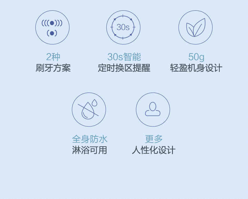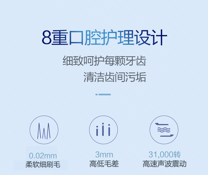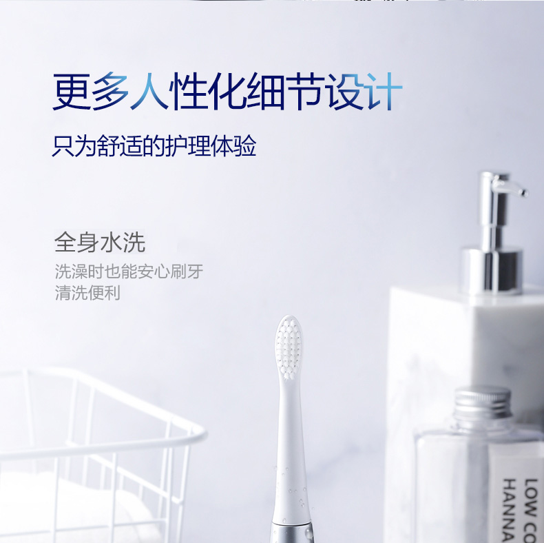轻柔模式:配合细刷头,温柔清洁,不刺激牙龈。