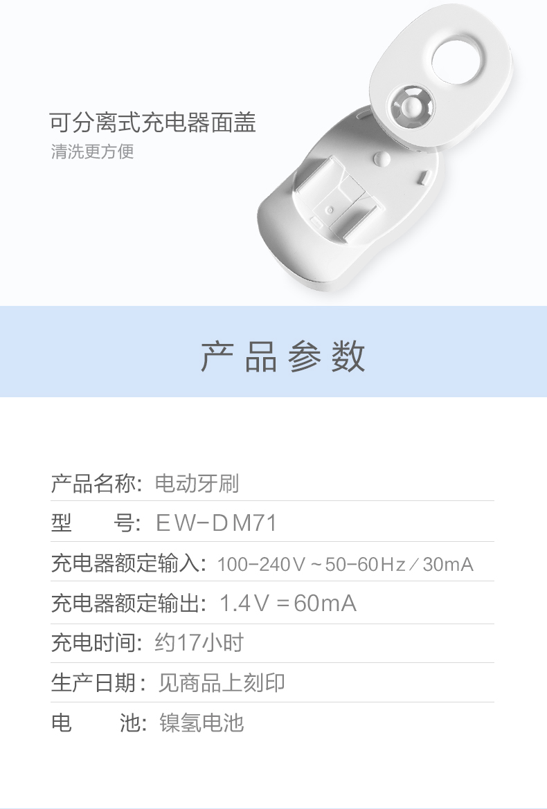 可分离式充电底座设计,充电拿取方便,拥有过充保护,满电后自动断电。机身整重50g,可全身水洗。
