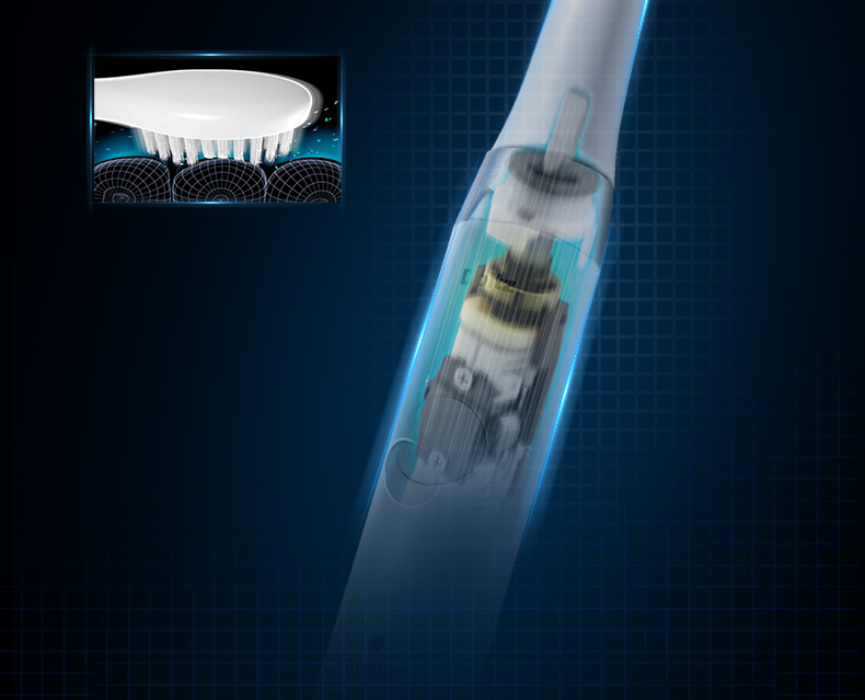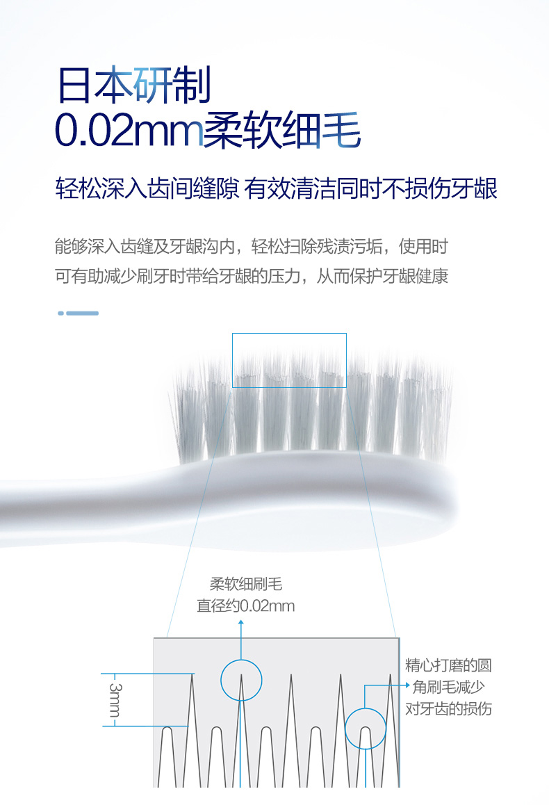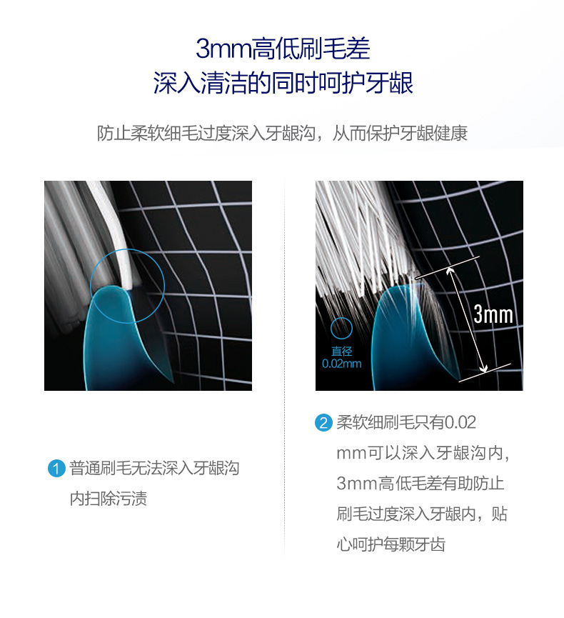 3mm高低错落刷头,高低不同的刷毛,能防止刷牙时刷毛过度深入牙龈;细腻的刷毛能减少细小牙渍残渣,呵护牙龈;