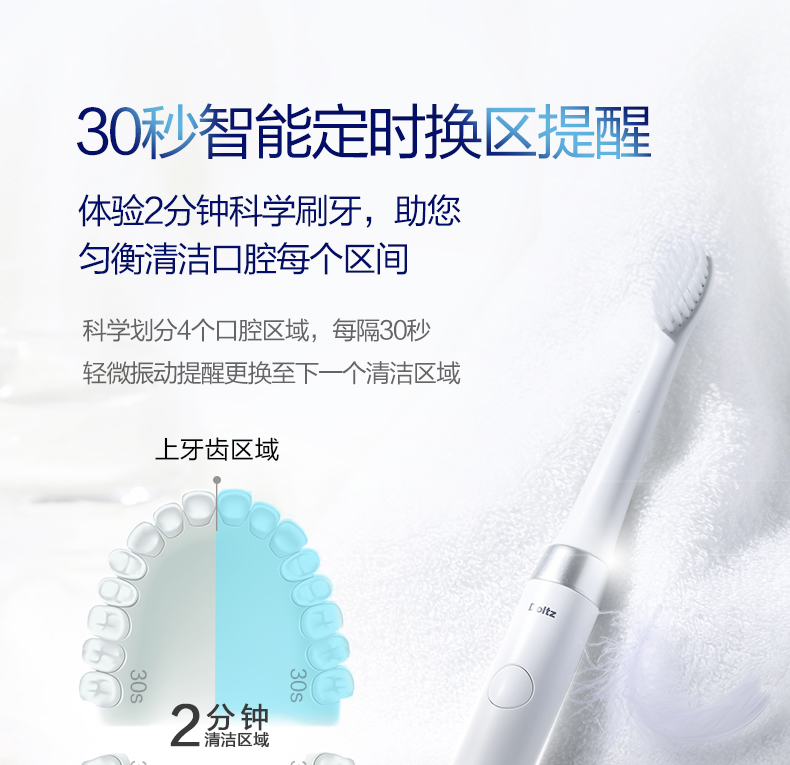 智能定时提醒功能,刷牙时将口腔分为4个区域,每隔30秒提醒清洁下一个区域,确保均匀清洁整个口腔。