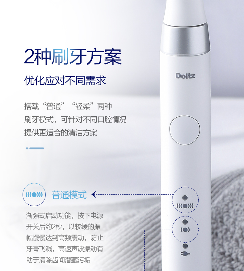 有2档刷牙模式,自上而下分别是普通模式、轻柔模式,根据不同的口腔环境进行选择。