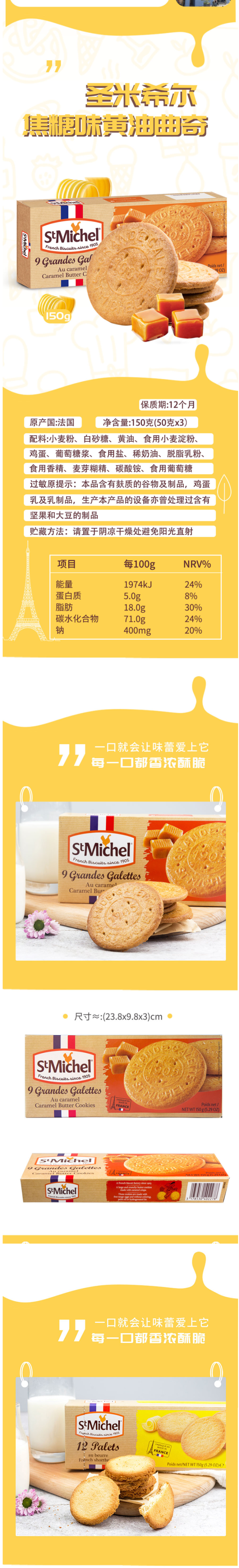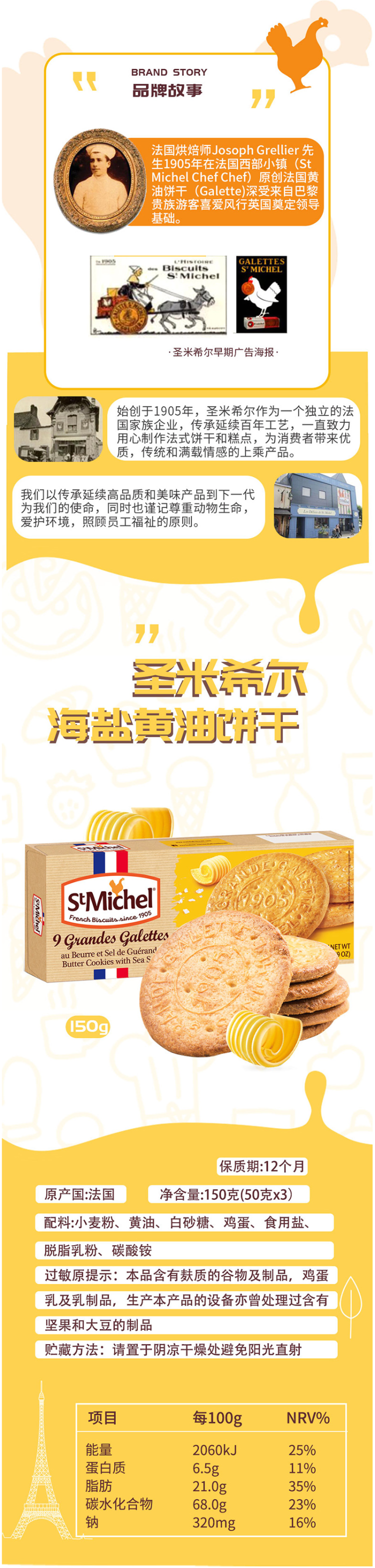 20世纪初期在一个名为圣米舍谢谢的法国小镇上。糕点师约瑟夫·葛勒利埃用烧木材的烤炉烤制出了金灿灿的圆形饼干,并命名为“圣米希尔饼干”,受到了全镇居民的一致好评。